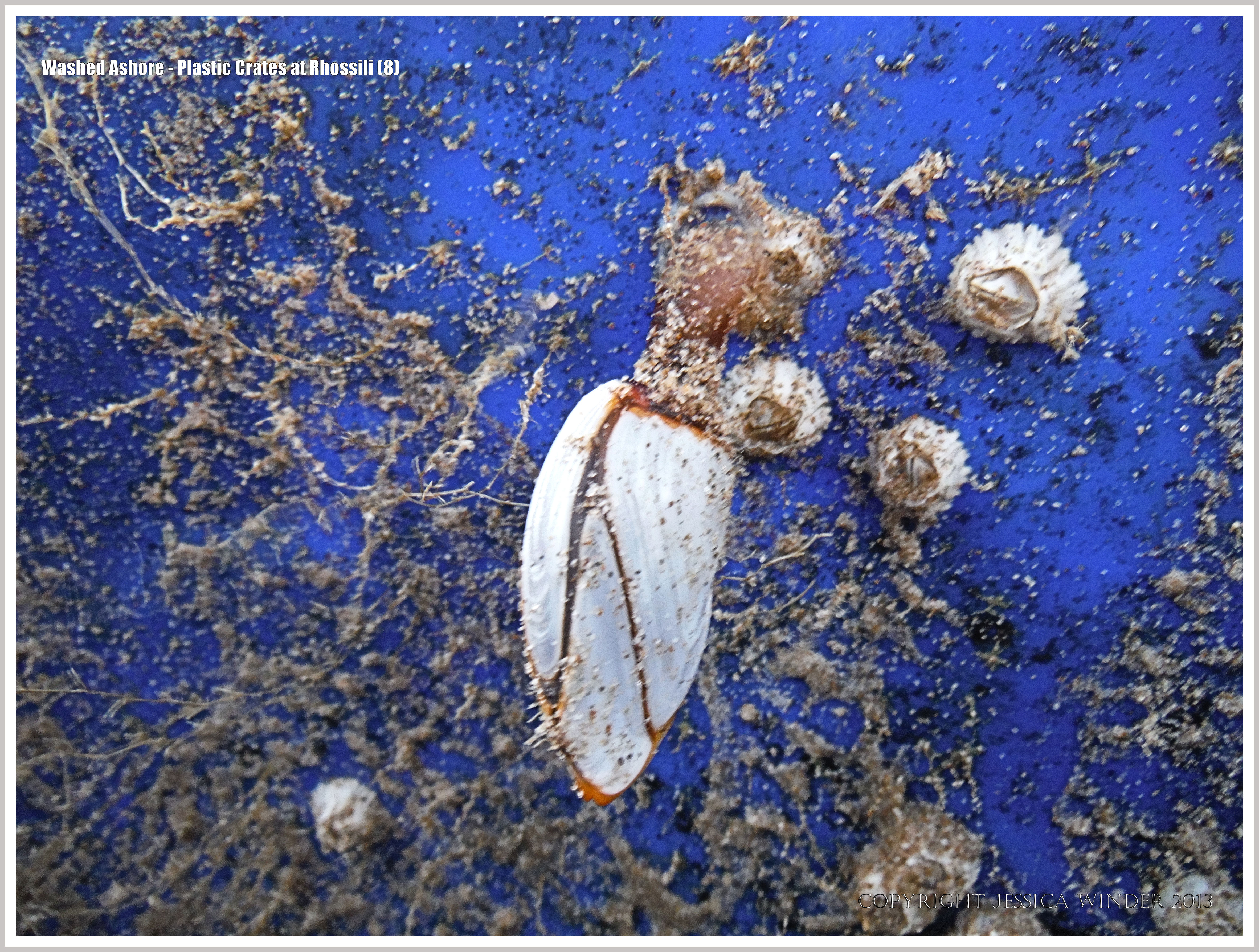 Washed Ashore – Plastic Crates at Rhossili 8 – Acorn barnacles and stalked goose barnacle on a blue plastic flotsam crate flotsam on Rhossili Beach, Gower, South Wales, December 2013.