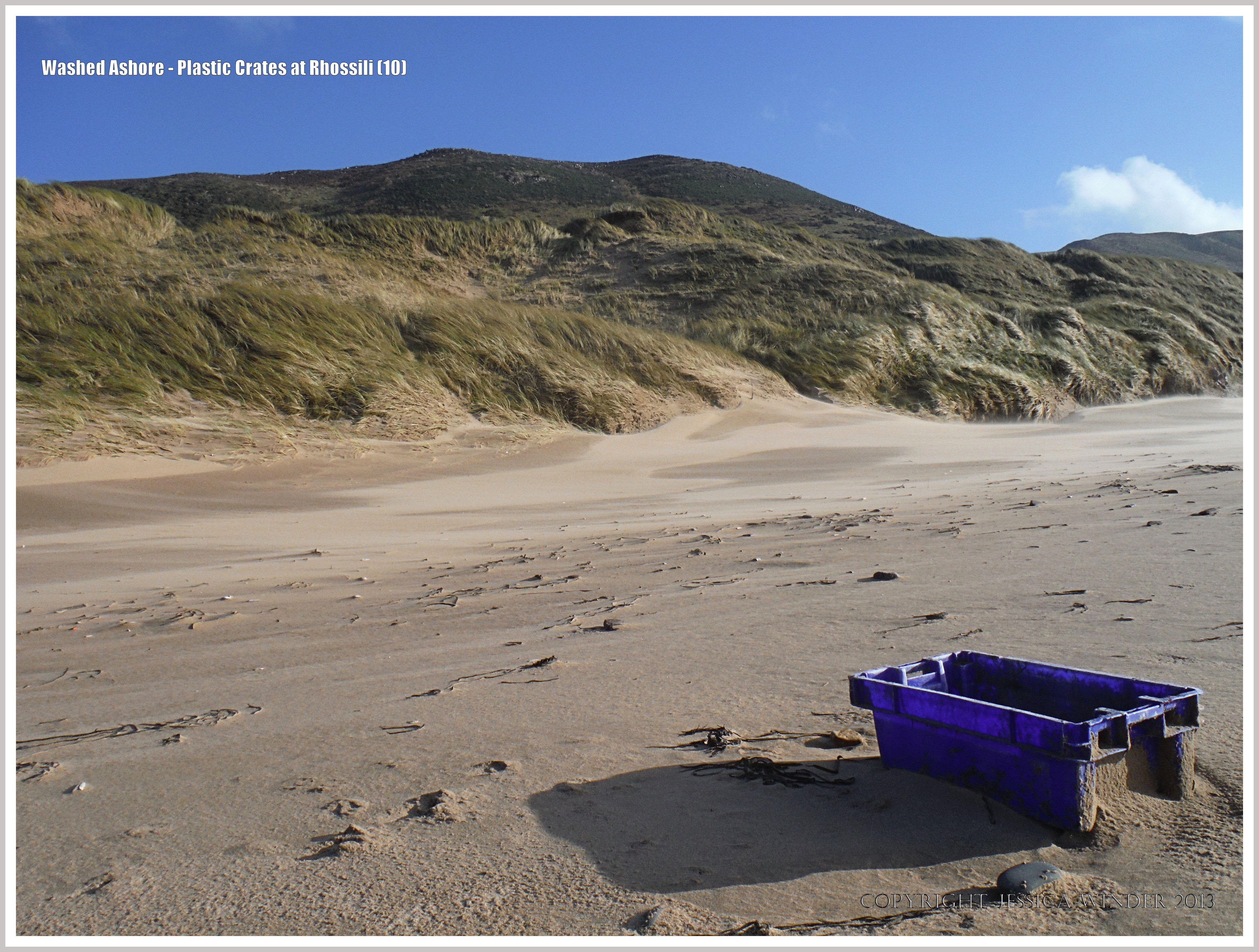 Washed Ashore – Plastic Crates at Rhossili 10 – Blue plastic flotsam crate on the beach at Rhossili, Gower, South Wales, December 2013.