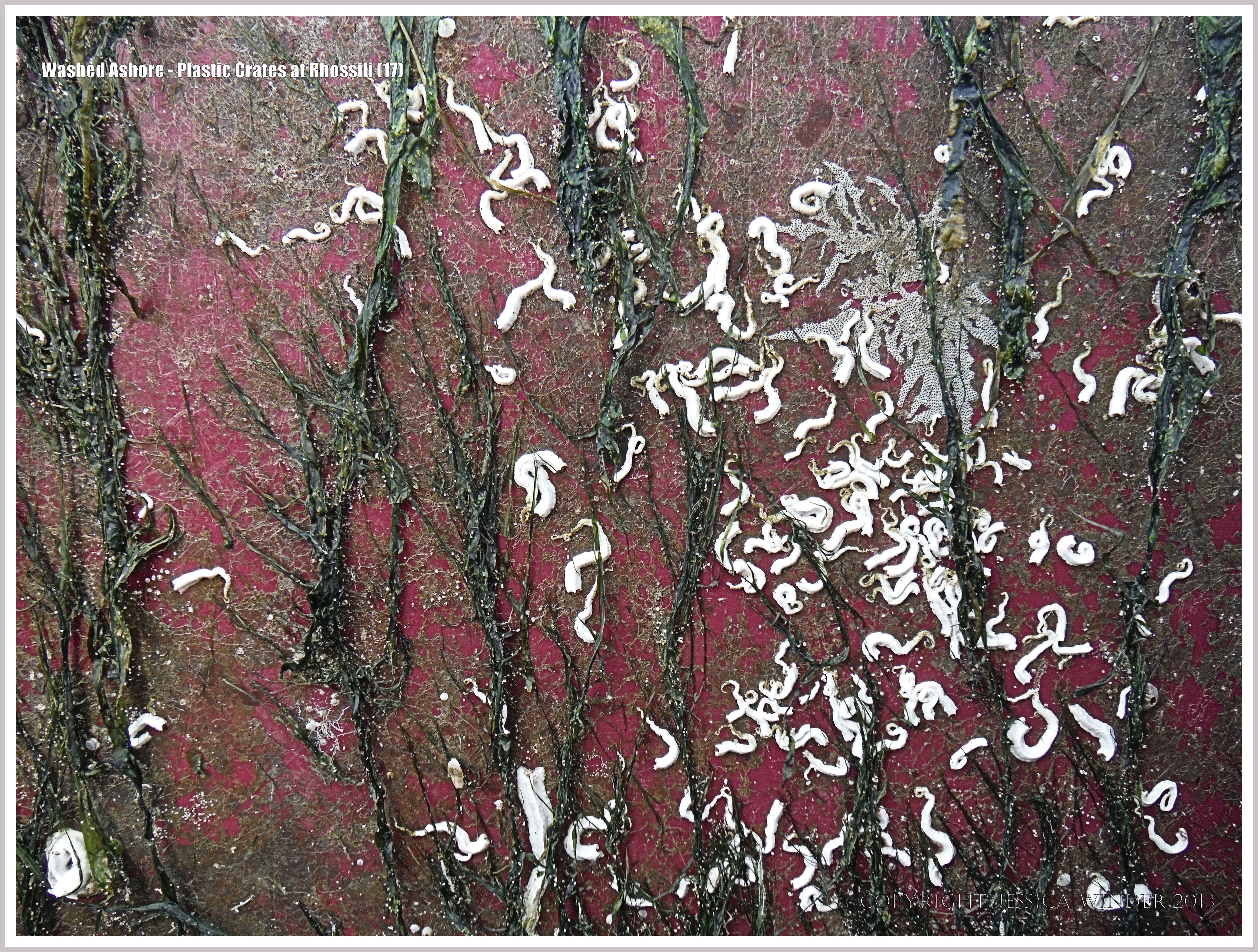 Washed Ashore – Plastic Crates at Rhossili 17 – Red plastic crate with attached seaweed and calcareous tubes of marine worms, found as flotsam on Rhossili beach, Gower, South Wales, December 2013.