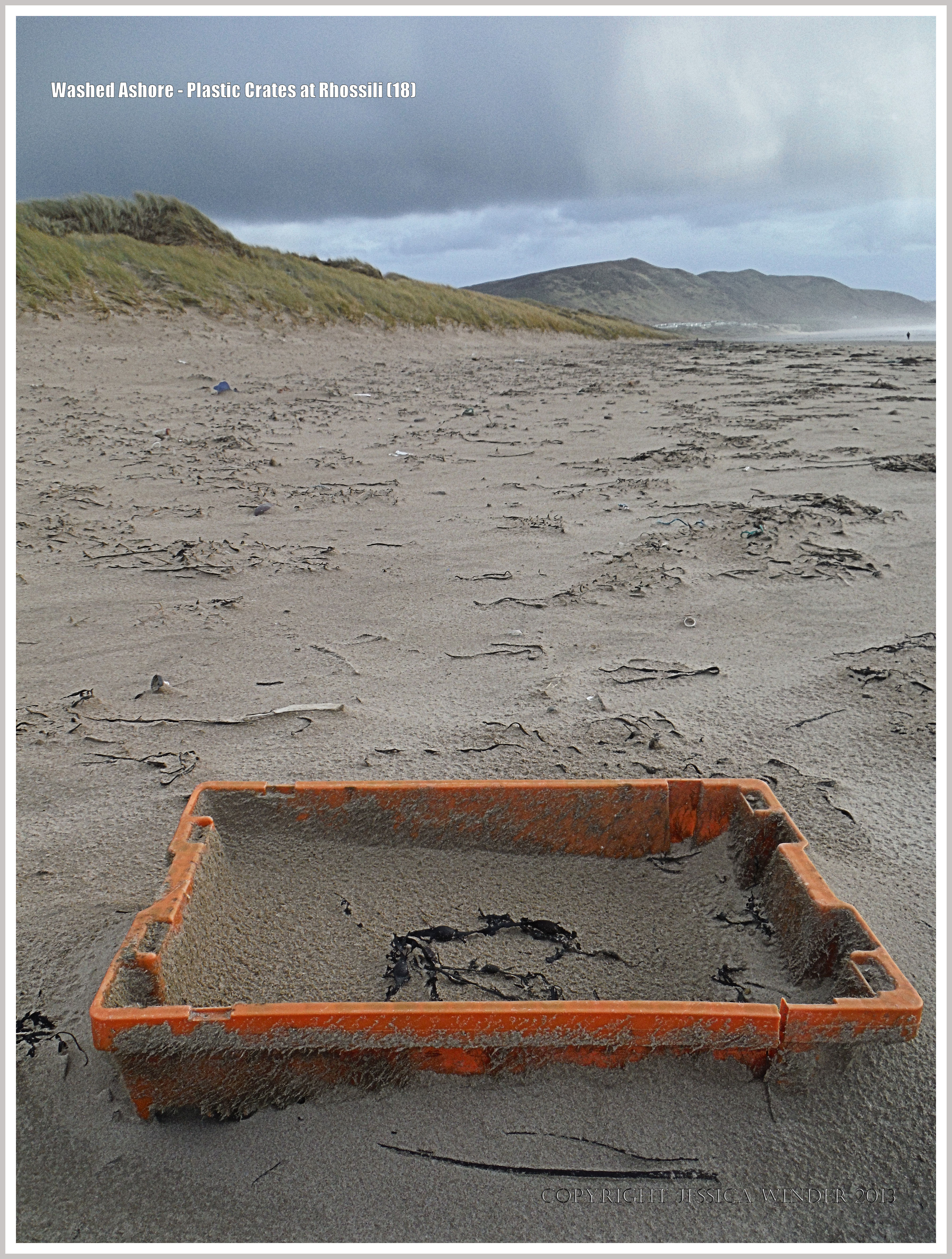 Washed Ashore – Plastic Crates at Rhossili 18 – Orange plastic crate flotsam on a sandy beach at Rhossili, Gower, South Wales, December 2013.