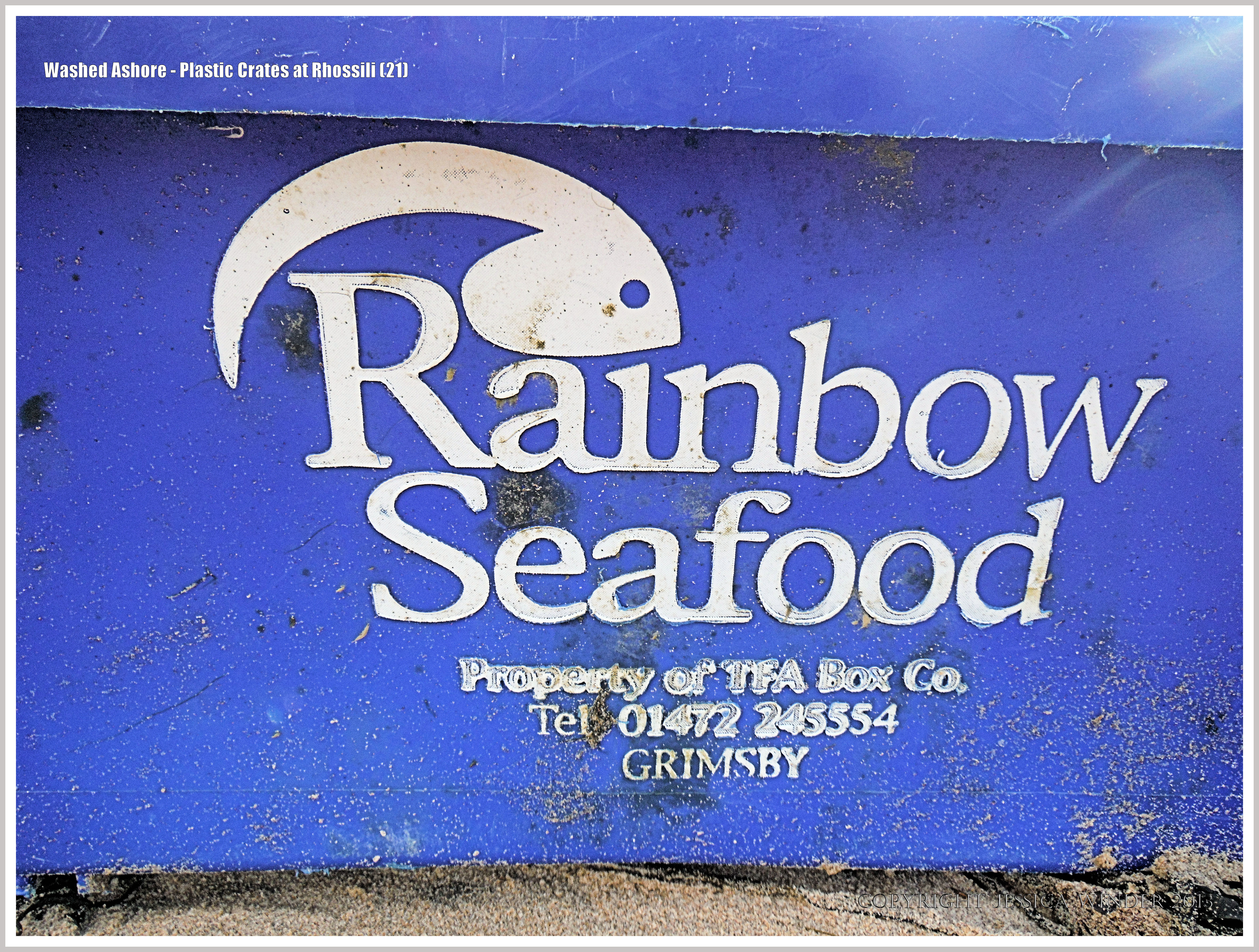 Washed Ashore – Plastic Crates at Rhossili 21 – Detail of blue plastic fisherman’s crate with white writing washed up as flotsam at Rhossili, Gower, South Wales, December 2013.