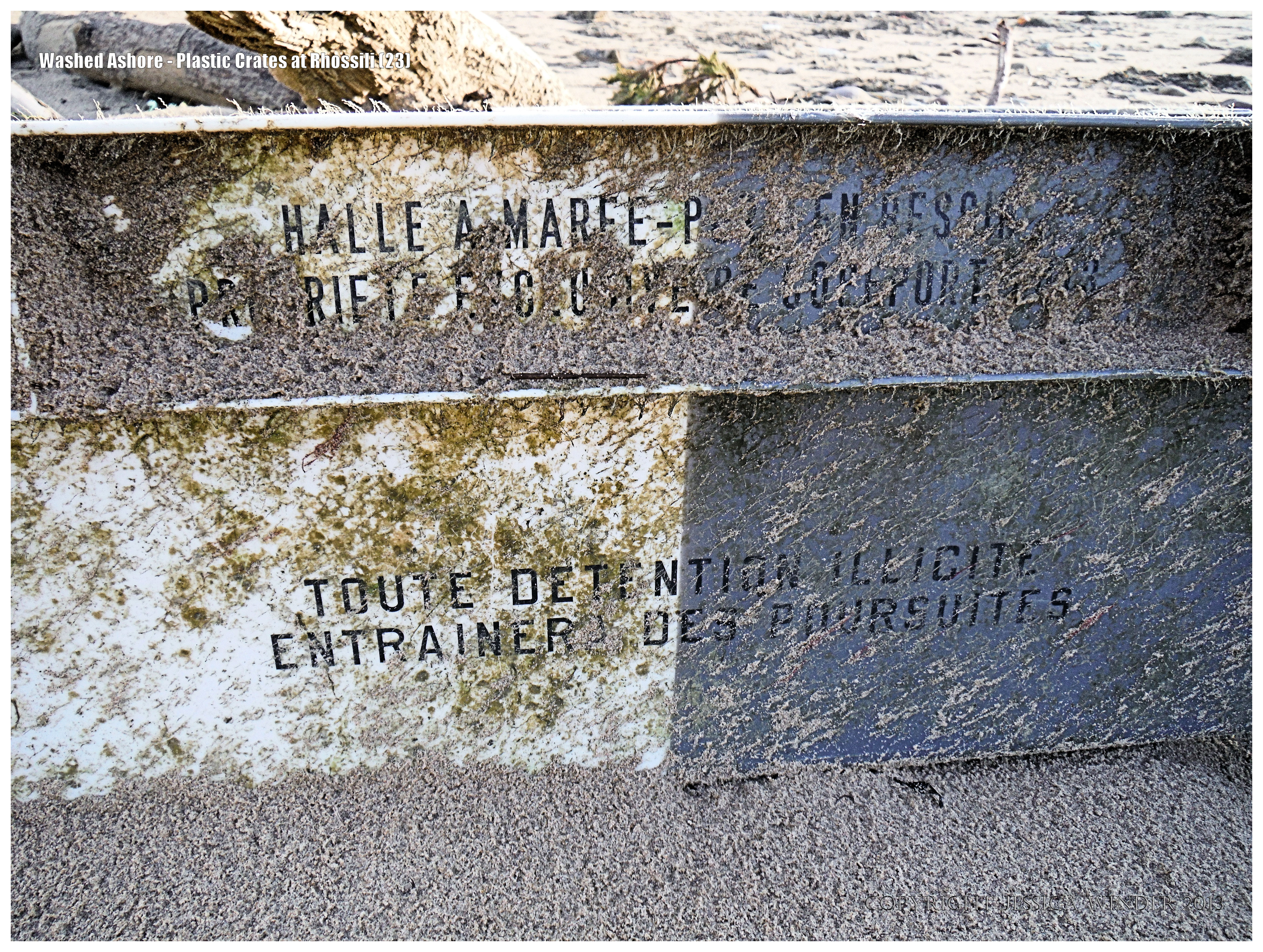 Washed Ashore – Plastic Crates at Rhossili 23 – Detail of black and white fishing crate with black writing found as flotsam on the beach at Rhossili, Gower, South Wales, December 2013.