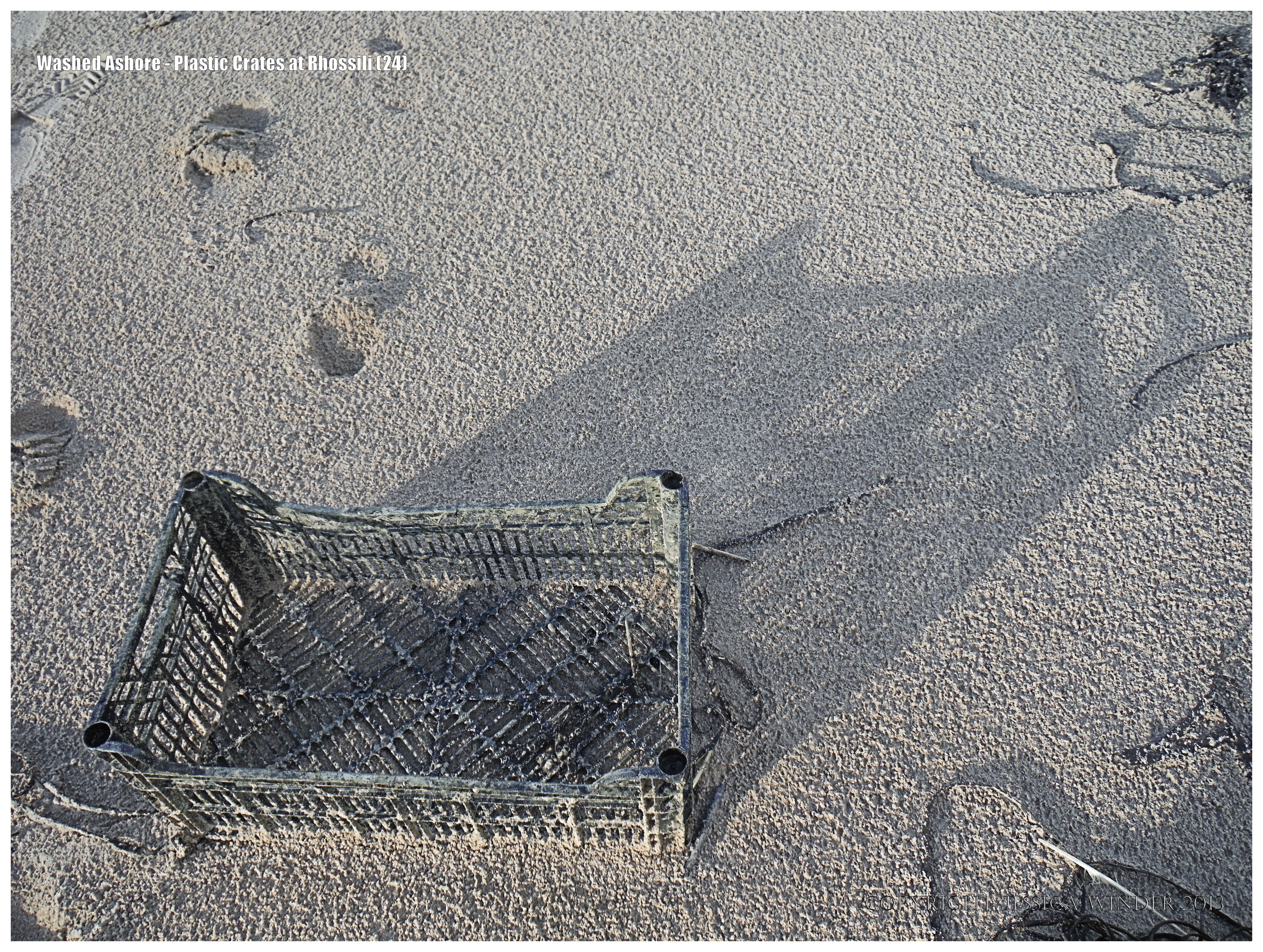 Washed Ashore – Plastic Crates at Rhossili 24 – Black plastic crate and shadow on sandy beach at Rhossili, Gower, South Wales, December 2013.