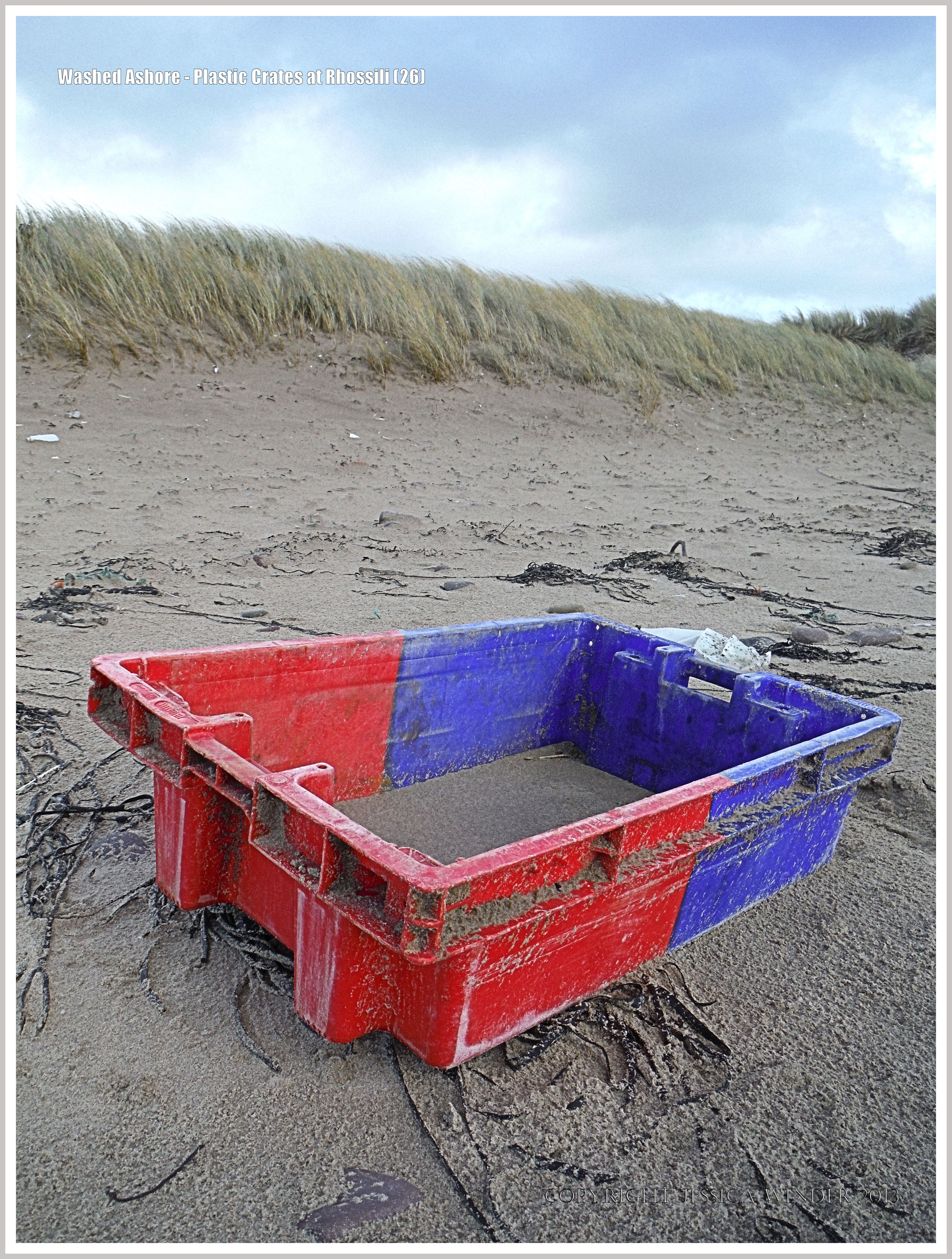 Washed Ashore – Plastic Crates at Rhossili 26 – Red and blue fishing crate flotsam on the beach at Rhossili, Gower, South Wales, December 2013.