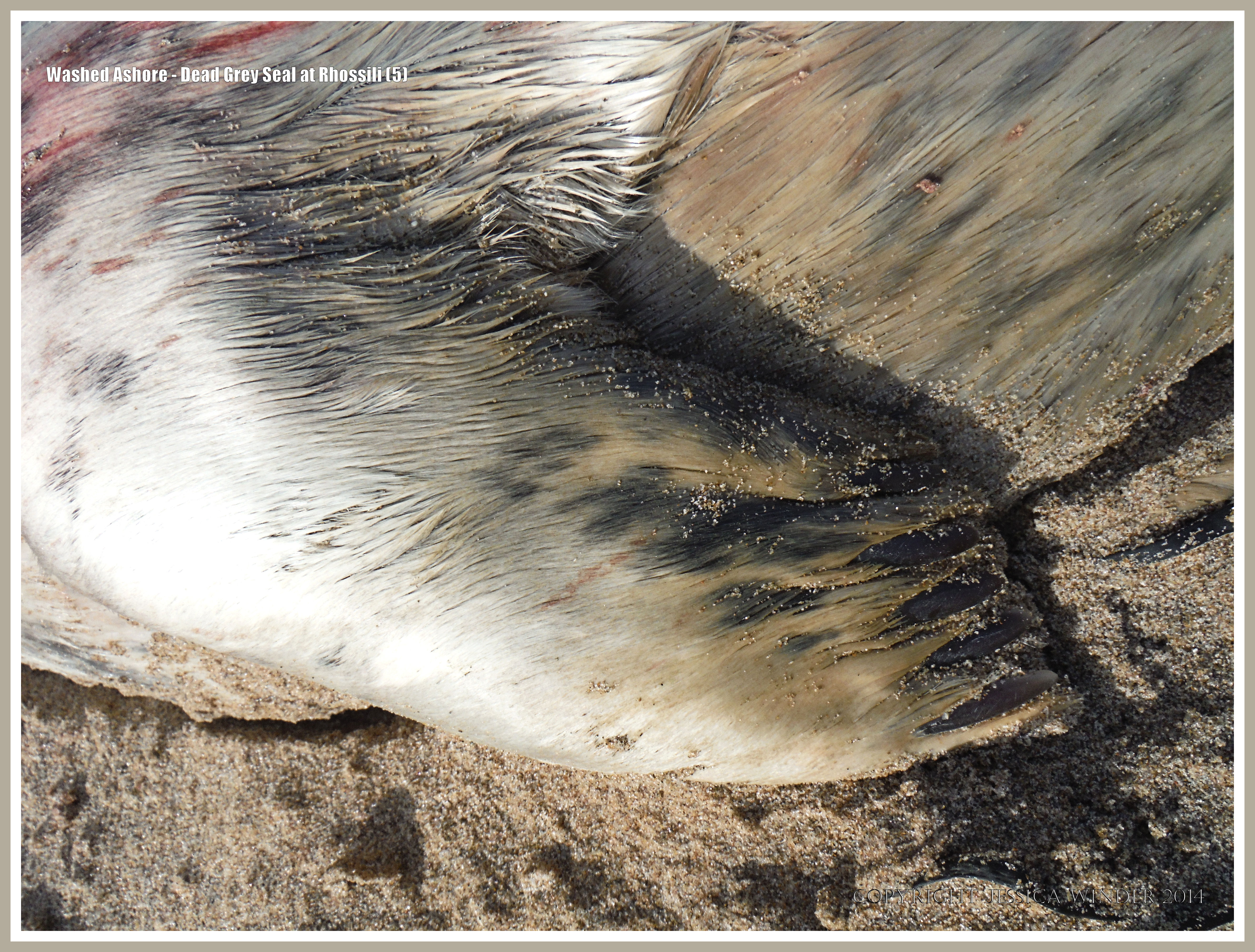 Washed Ashore – Dead Grey Seal 5: Detail of the fore limb of a young dead Grey Seal (Halichoerus grypus) washed up on the sand at Rhossili, Gower Peninsula, South Wales, December 2013.