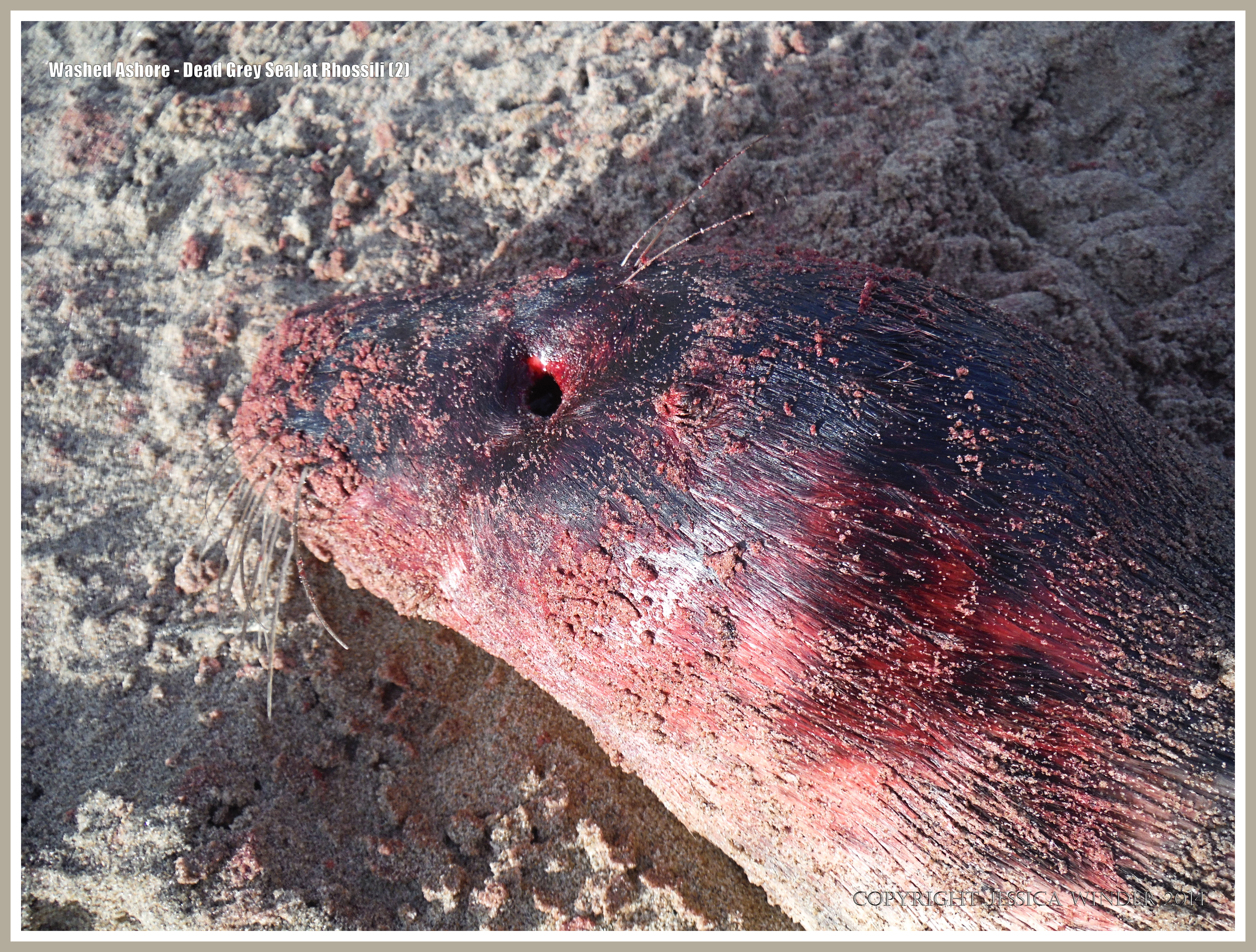 Washed Ashore – Dead Grey Seal 2: Close-up of the bloodied, eyeless, head of a dead young Grey Seal washed onto the shore by winter storms at Rhossili, Gower Peninsula, South Wales, December 2013.