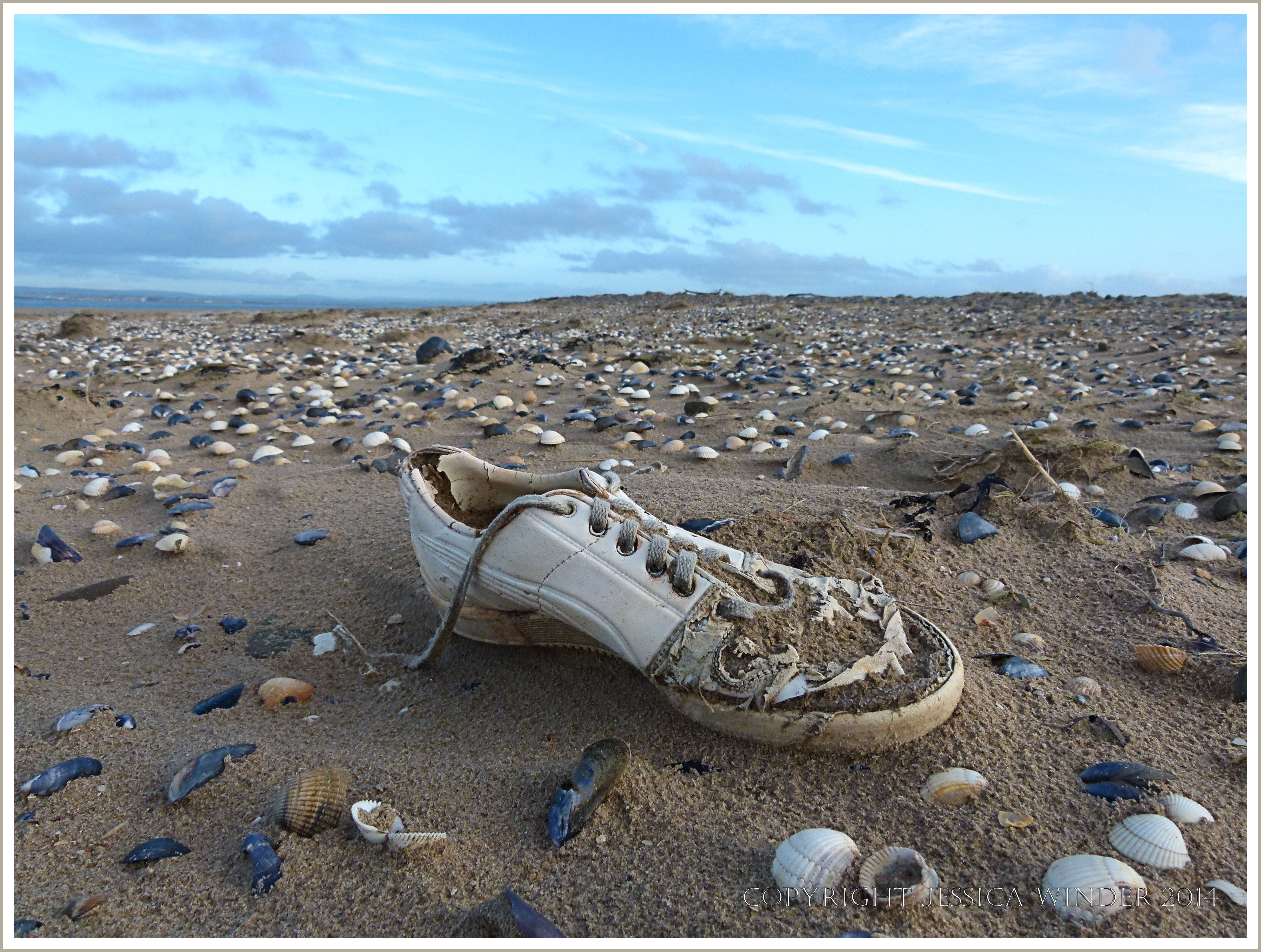 Washed Ashore – Flotsam Shoes 1: White trainer shoe washed up on sand with cockle and mussel shells at Whiteford Sands, Gower, South Wales, December 2013.
