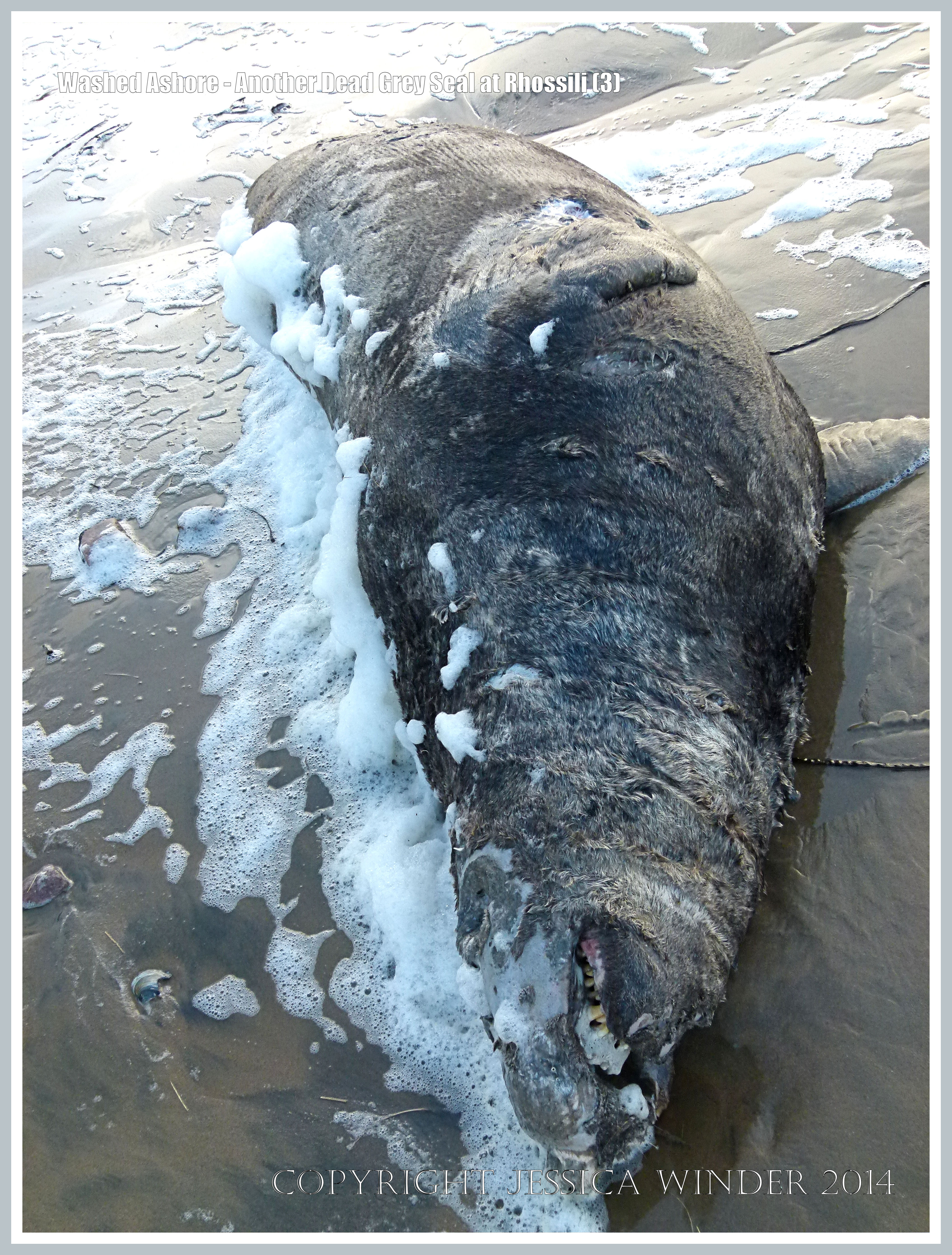 Washed Ashore – Another Dead Grey Seal 3: Dead adult Grey Seal washed ashore with sea foam at Rhossili, Gower, South Wales.