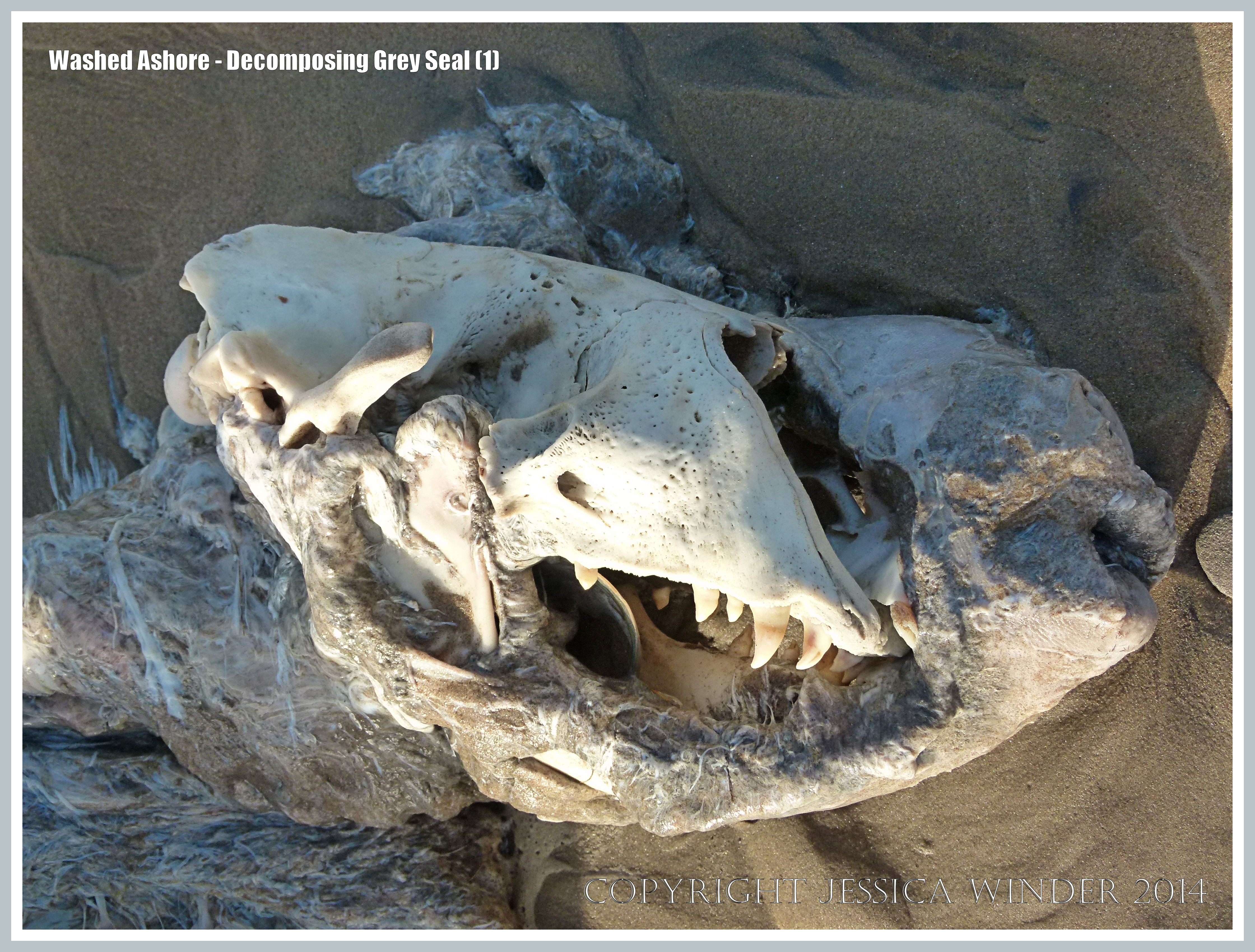 Washed Ashore – Decomposing Grey Seal 1: Skull of Grey Seal (Halichoerus grypus) exposed by rotting flesh on a carcass washed up as flotsam on Rhossili Beach, Gower Peninsula, South Wales, December 2013.