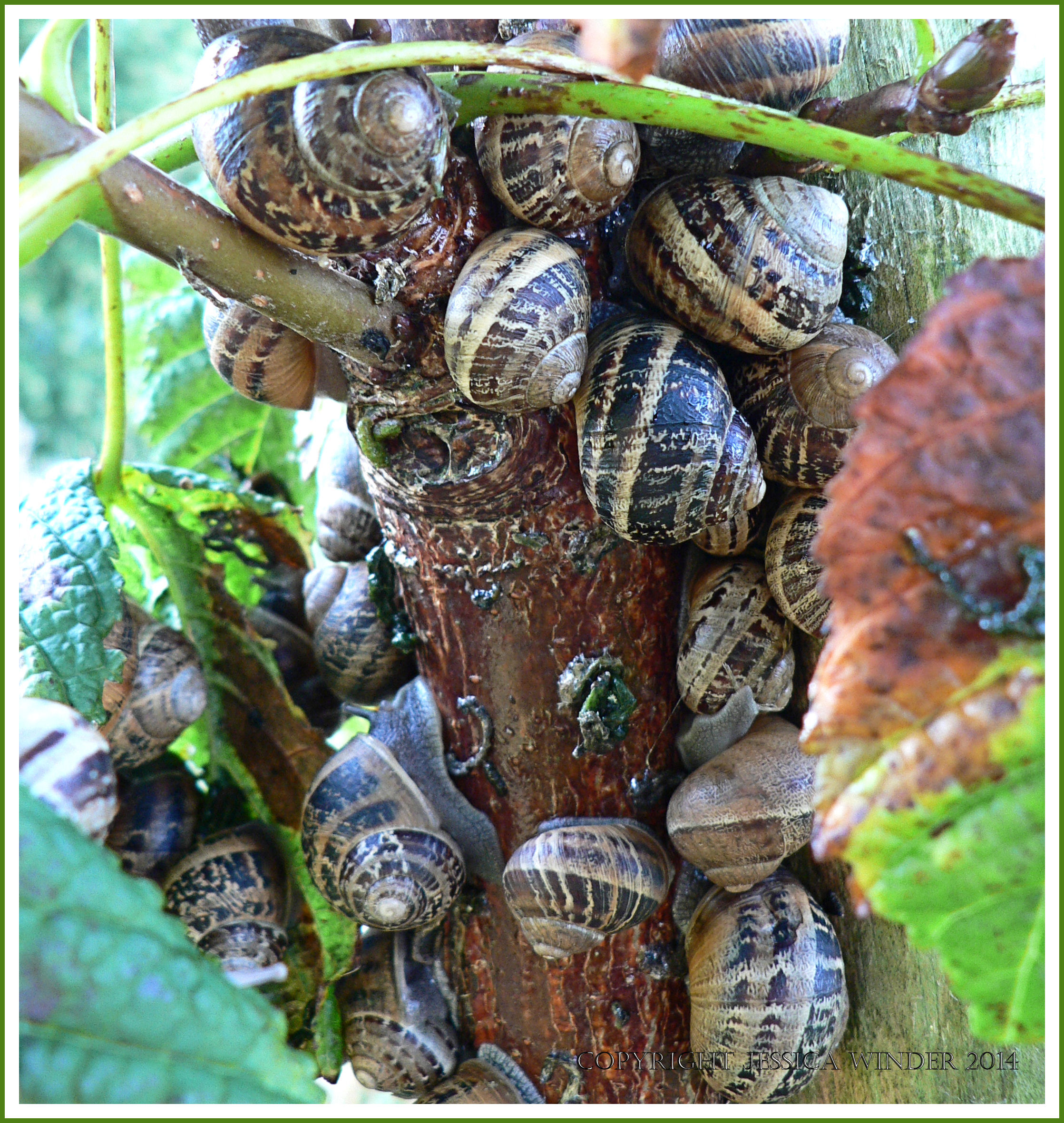 Miscellaneous Snails 5 Miscellaneous Snails 5: Lots of Common Garden Snails (Helix aspersa Muller) on the trunk of a sapling