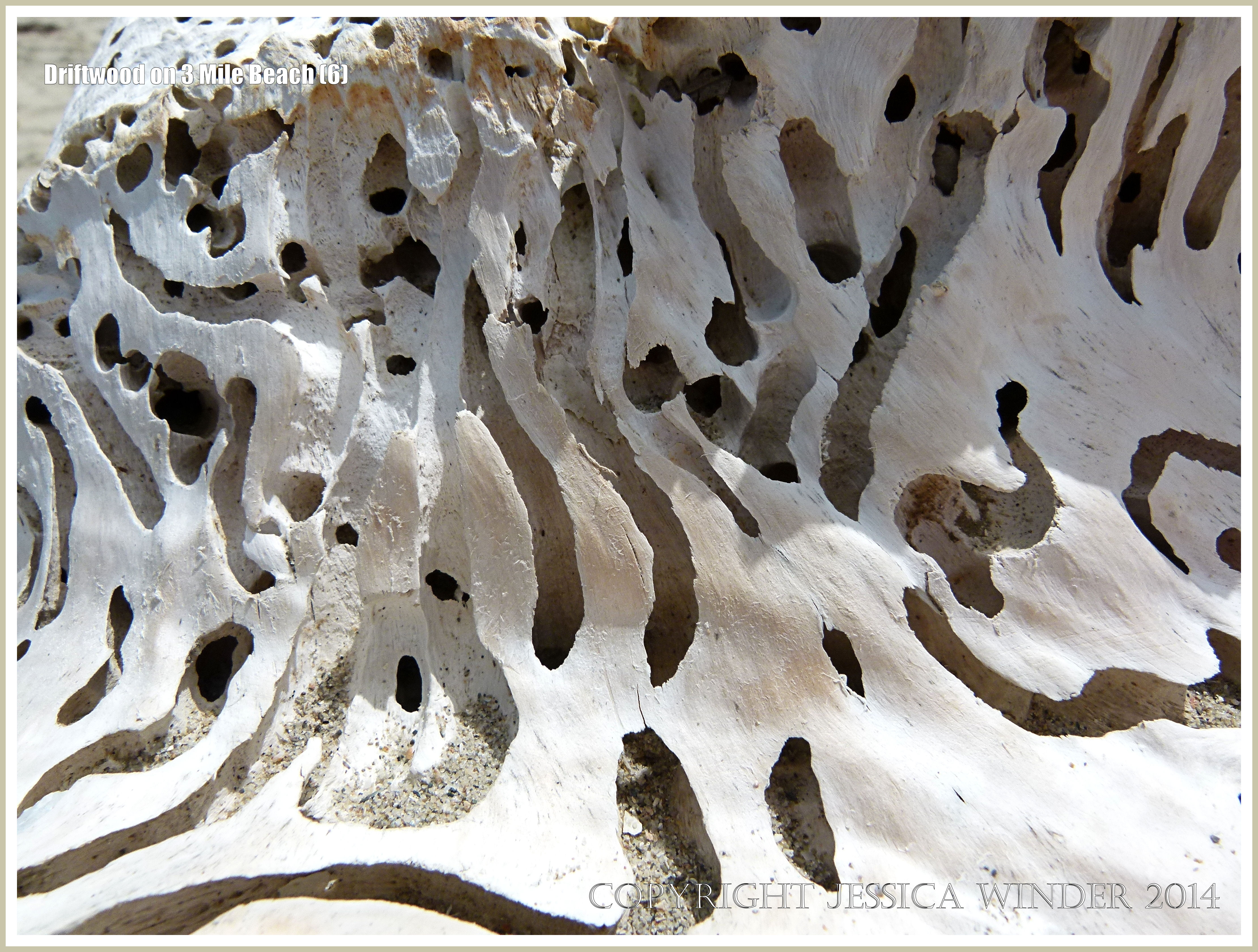 Driftwood On 3 Mile Beach 6 – Shipworm holes in bleached white driftwood washed ashore at Three Mile Beach at Port Douglas in Queensland, Australia.