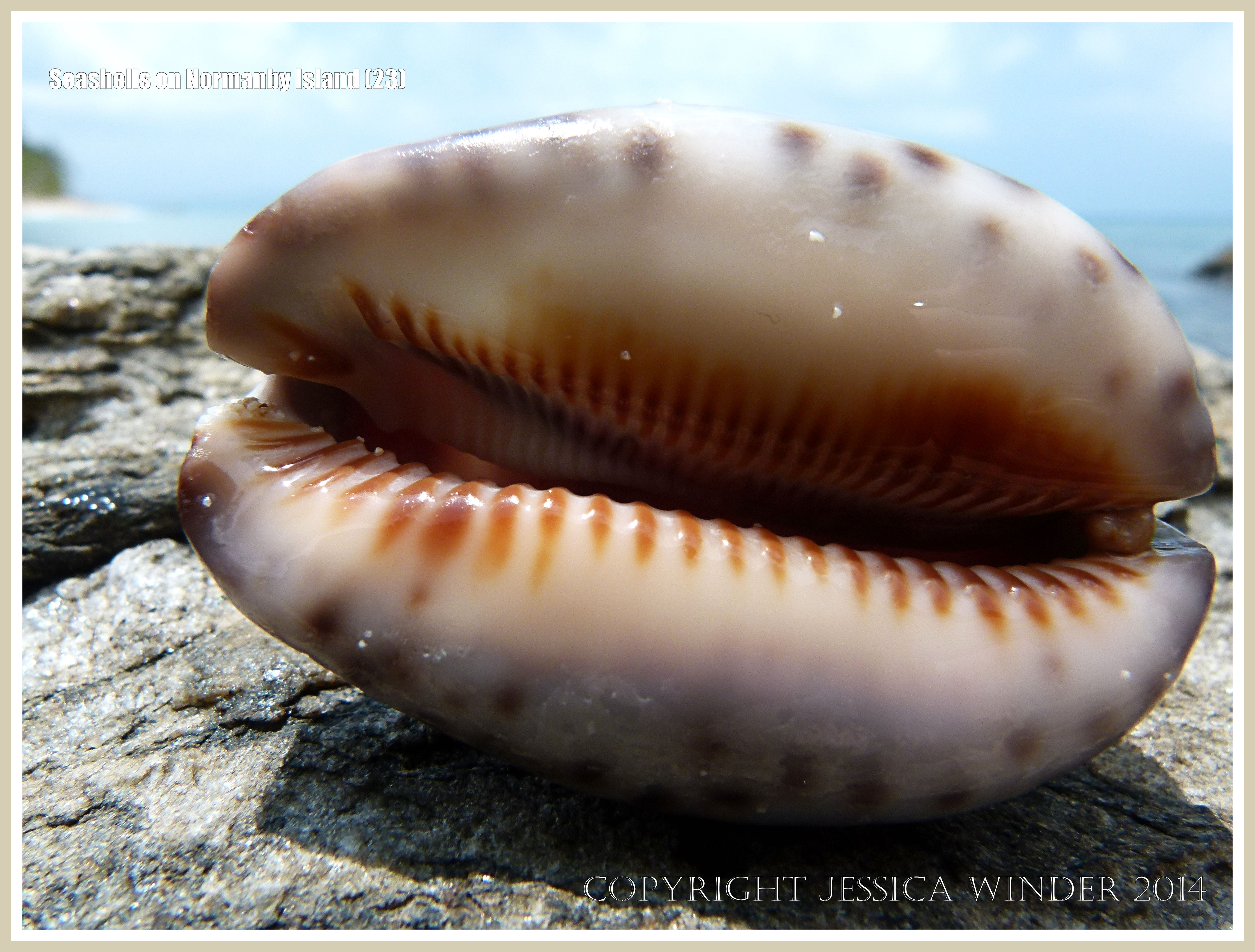 Seashells on Normanby Island 23 – Tropical Australian cowrie seashell photographed on the beach at Normanby Island National Park, part of the Frankland Island group, on the Great Barrier Reef off the Queensland Coast.