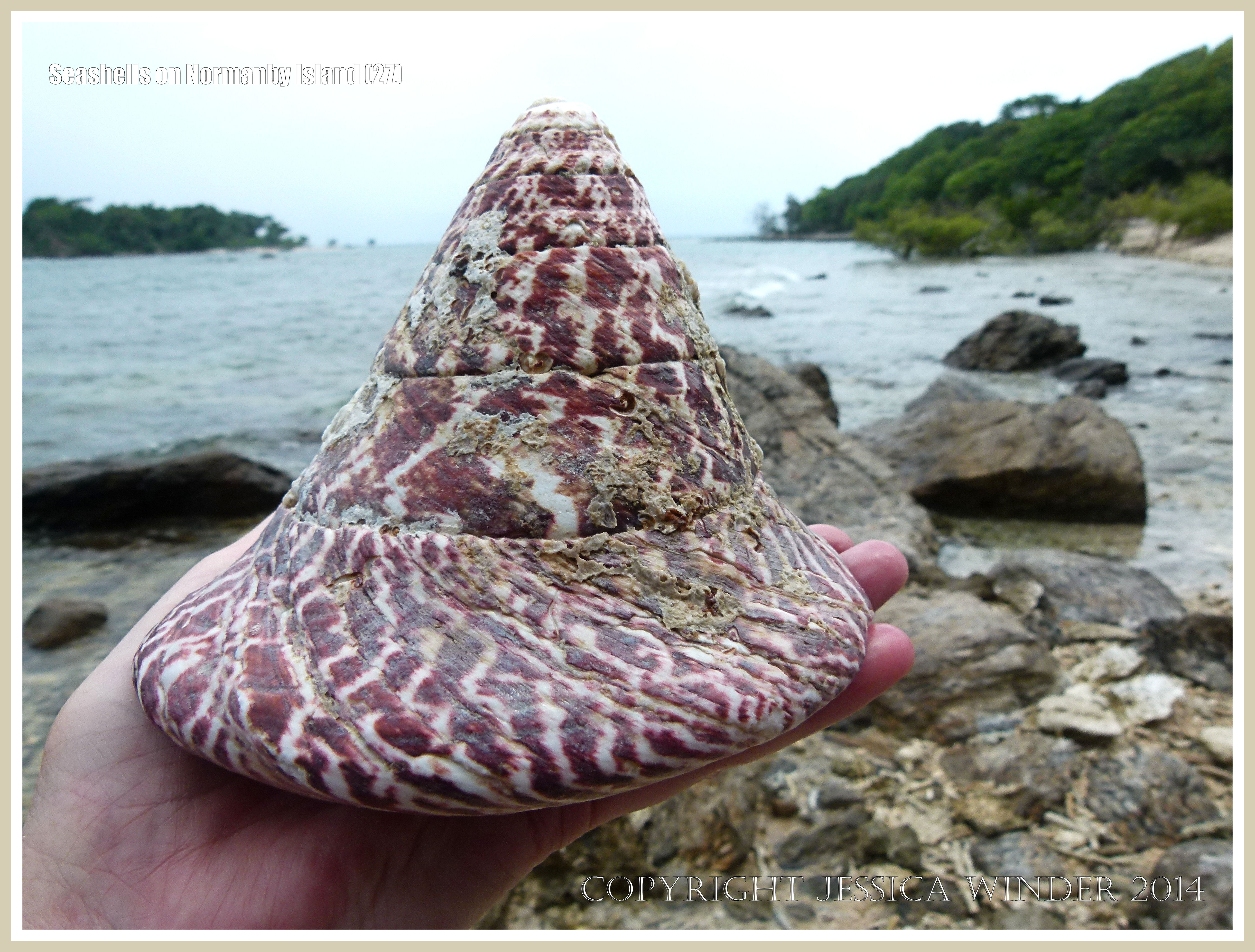 Seashells on Normanby Island 27 – Tropical Australian gastropod Button or Pearly Top seashell photographed on the beach at Normanby Island National Park, part of the Frankland Island group, on the Great Barrier Reef off the Queensland Coast.