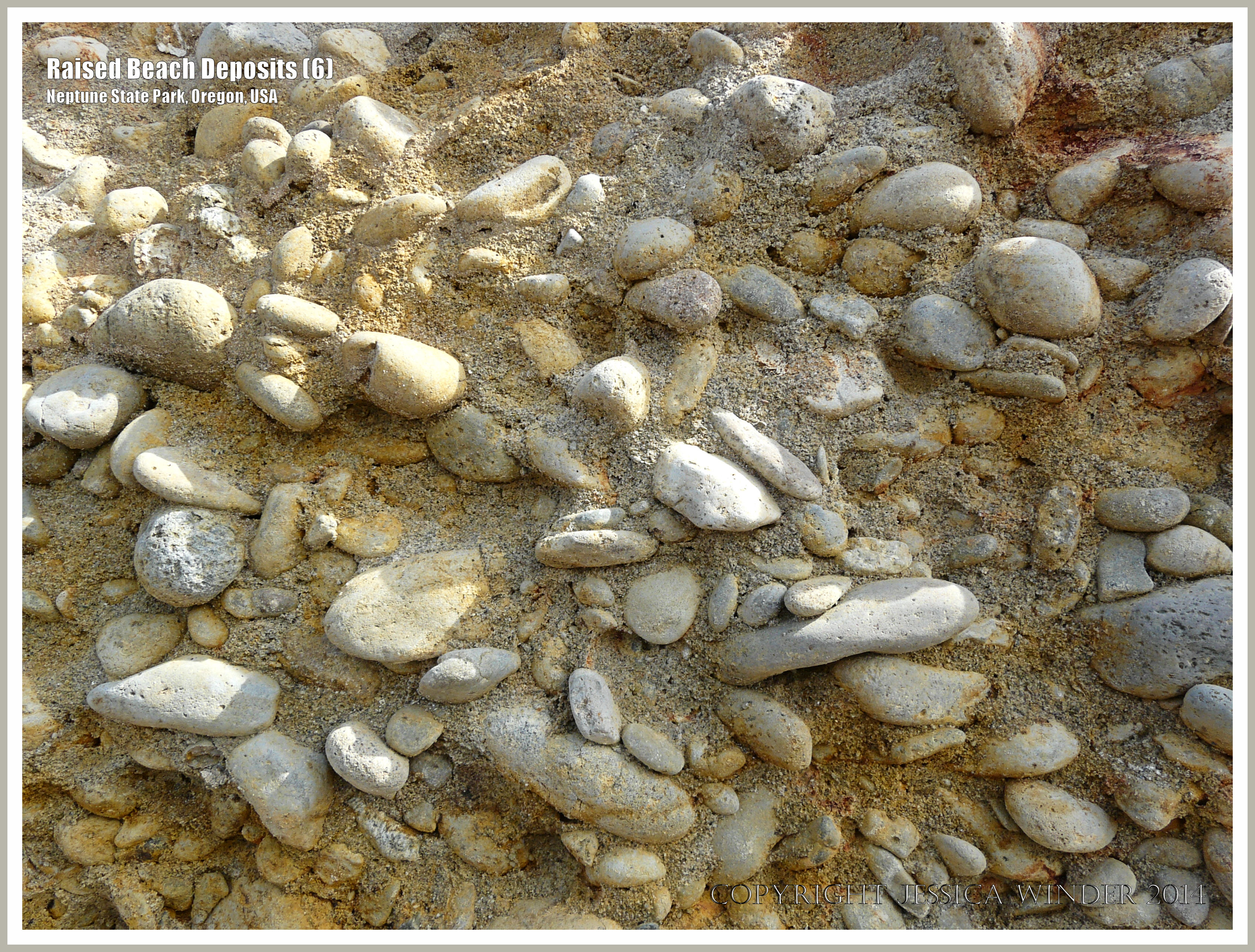 Raised Beach Deposits at Neptune State Park 6 – Sea cliff of terrace material comprising pebble conglomerate (as shown) and sandstone above a wave-cut basalt bench on the shore of the Pacific Ocean coast in Oregon, USA.