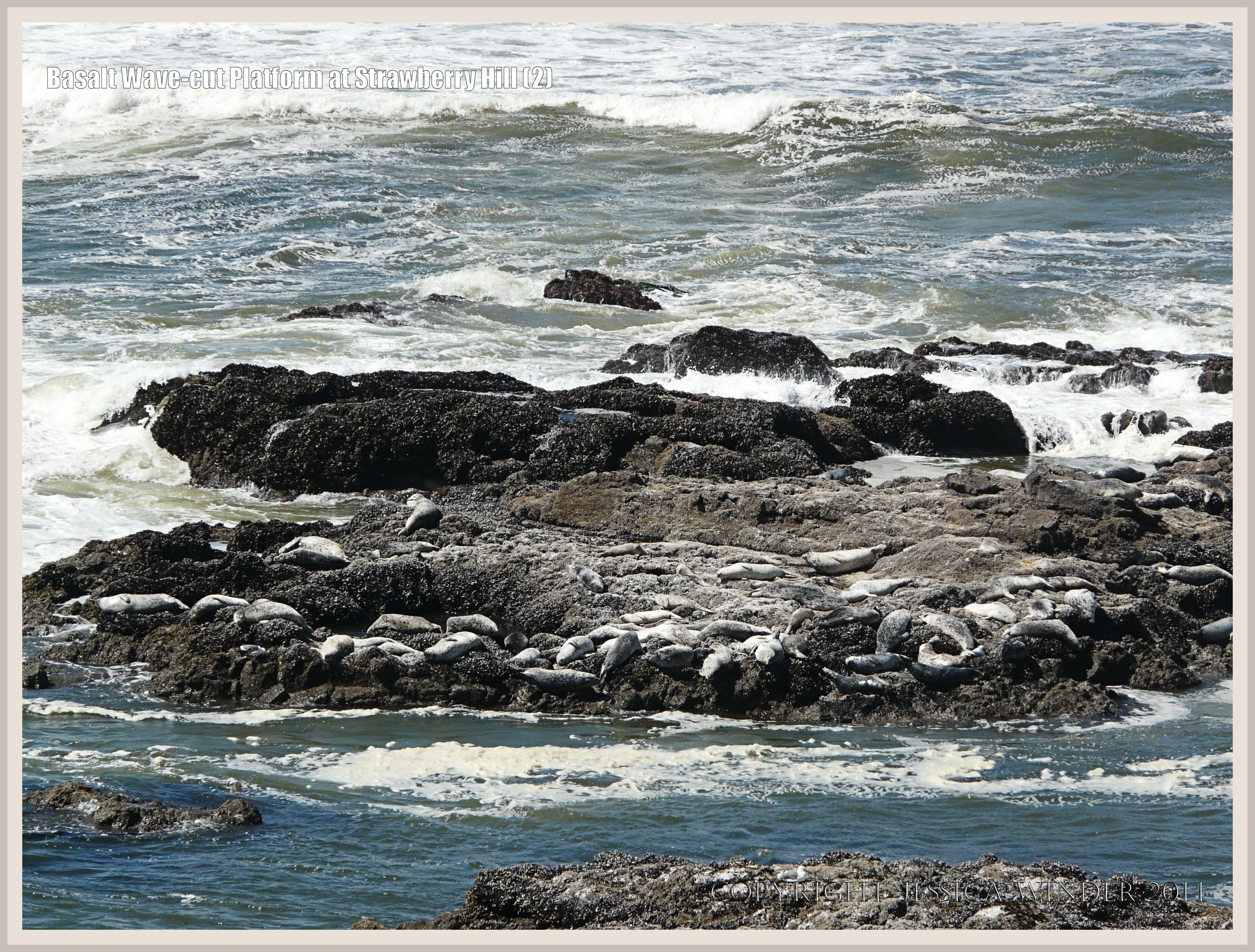 Wave-Cut Platform at Strawberry Hill 2 – Remnant of basalt wave-cut platform, cut off by the rising tide, with sun-bathing Harbour Seals at Strawberry Hill near Neptune State Park, Oregon, USA.