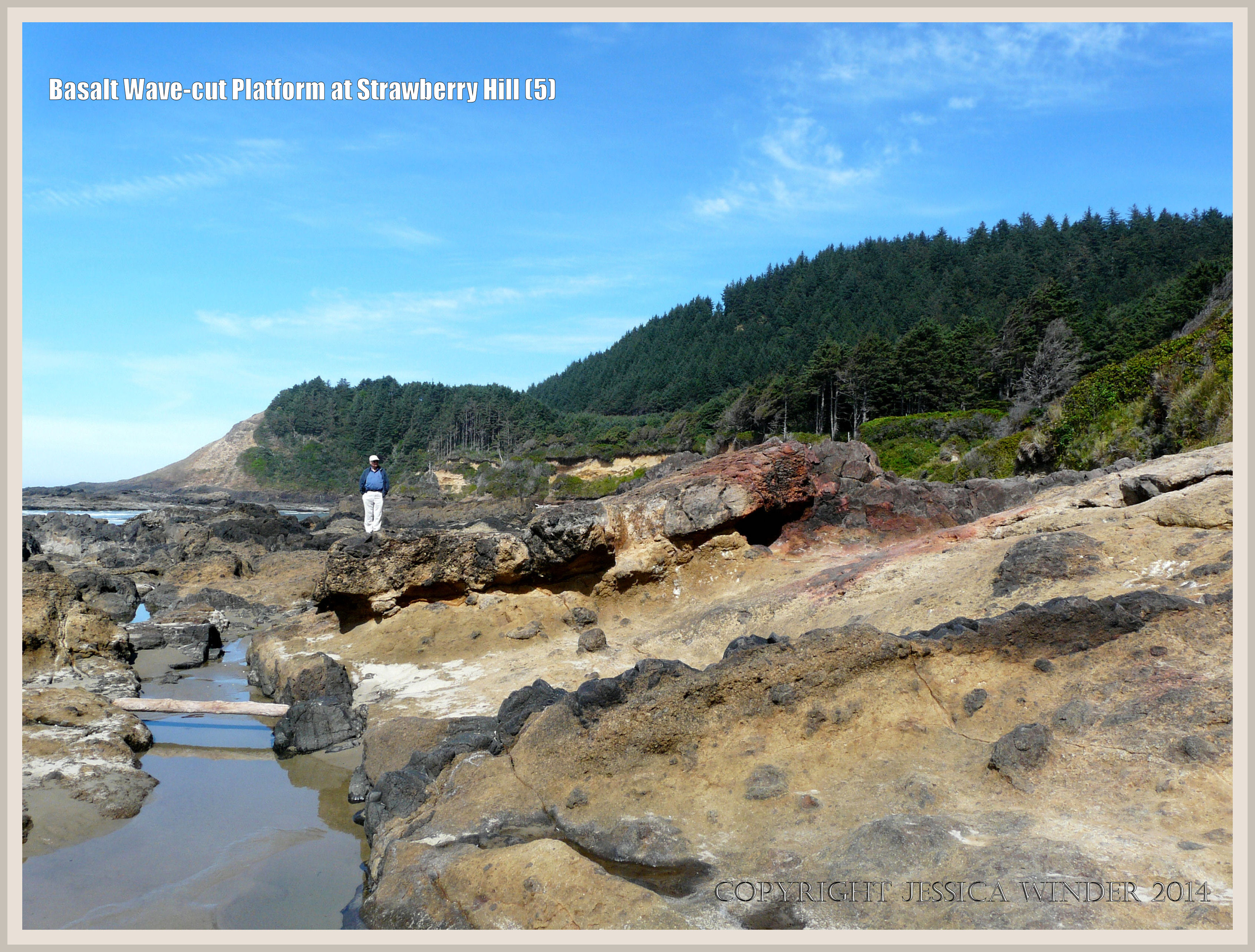Wave-Cut Platform at Strawberry Hill 5 – Remnants of a wave-cut platform of mostly fragmental basalt on the Oregon Coast, dissected by linear dikes of darker and more uniform basalt.
