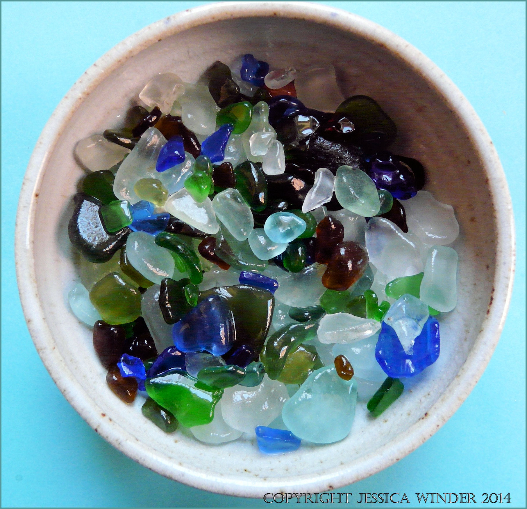 Miscellaneous Sea Glass 2 – Brightly coloured smooth pieces of sea or beach glass from Dorset beaches in England, arranged in a pottery bowl.