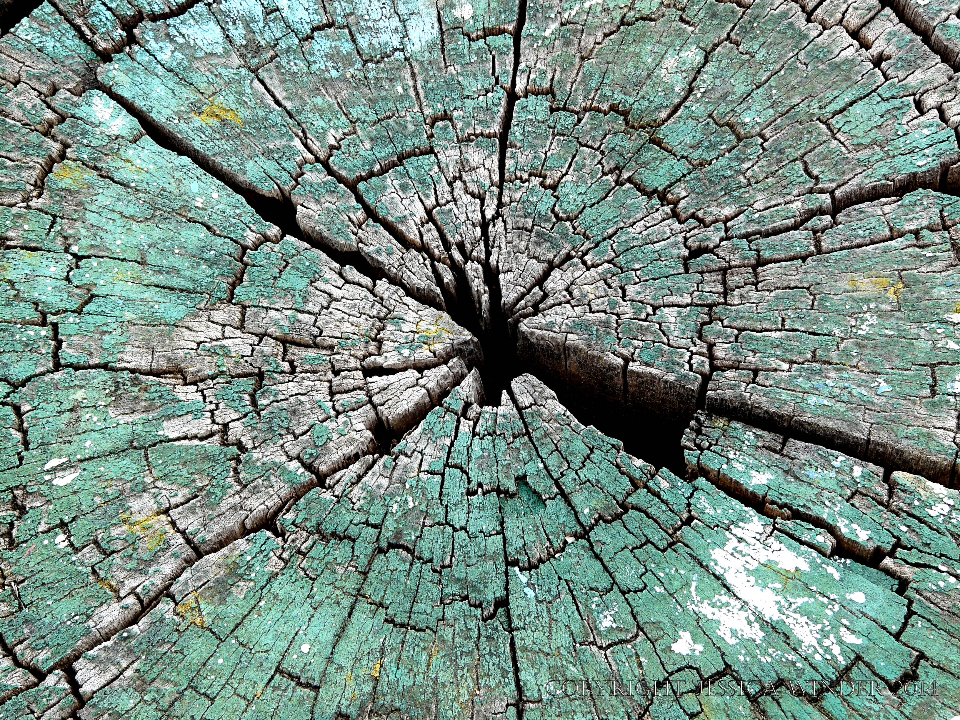 Weathering Harbourside Timbers 4 – Cross-section through a weathered timber post with remnants of green paint at the harbourside showing textured wood and patterns of radial and concentric splits opening along the woodgrain.