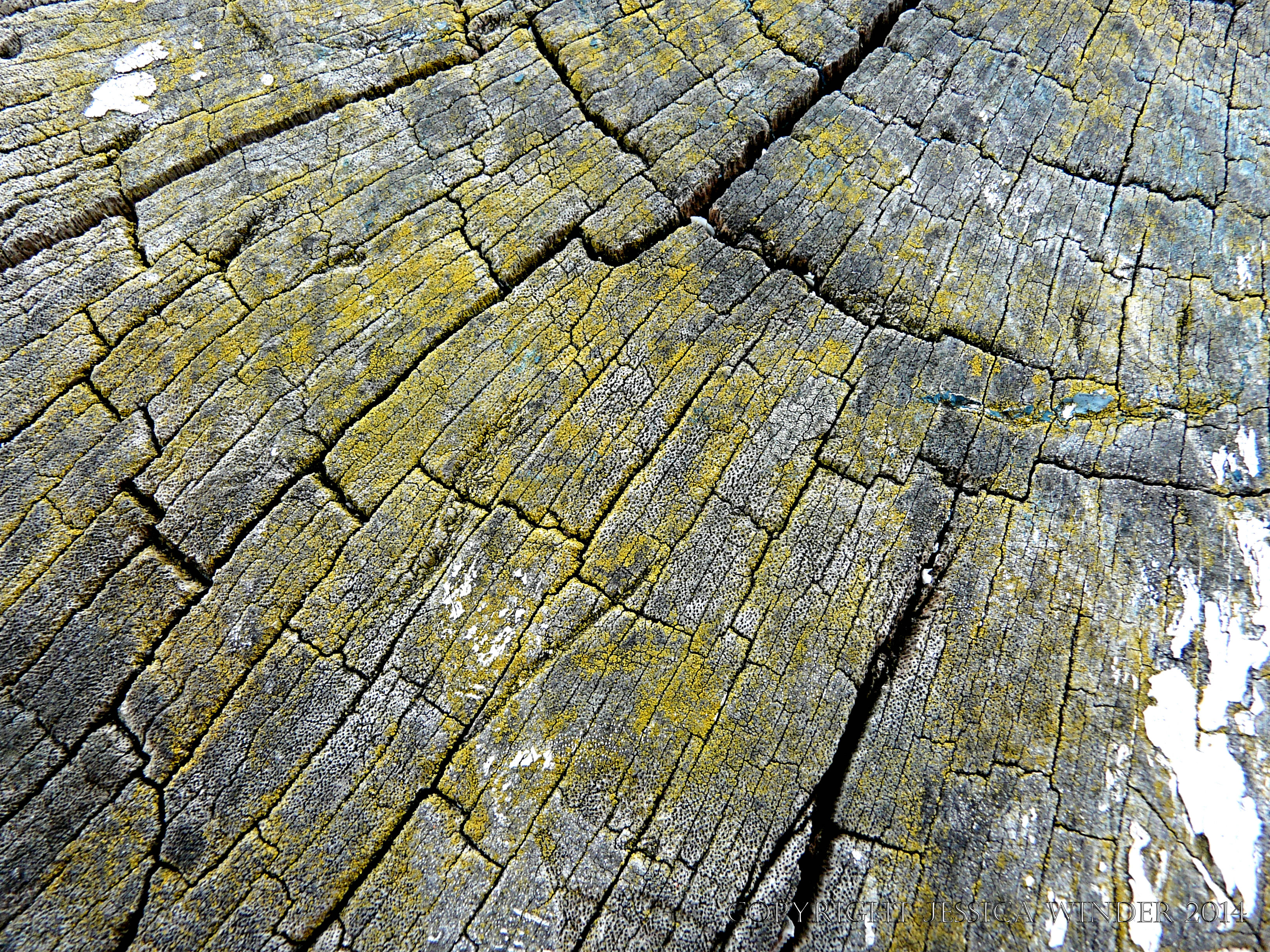 Weathering Harbourside Timbers 8 – Cross-section through a weathered timber post at the harbourside showing touches of yellow lichen on the textured wood surface and patterns of radial and concentric splits opening along the woodgrain.