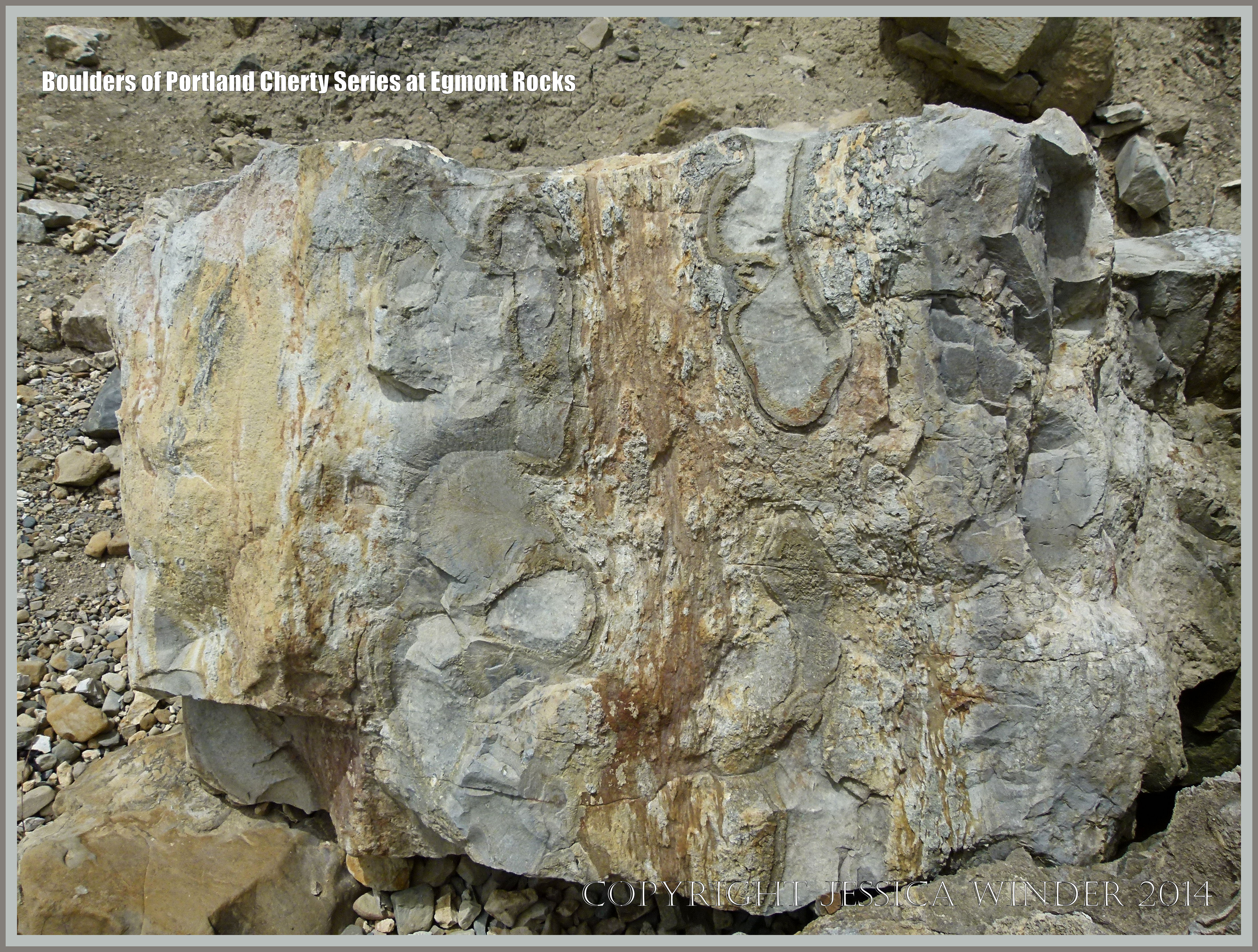 Portland Cherty Series At Egmont Rocks 9 – Close-up of a beach boulder of Portland Cherty Series that has fallen to the shore at Egmont Rocks near Chapmans Pool from the top of Houns-tout on the Jurassic Coast in Dorset, England.