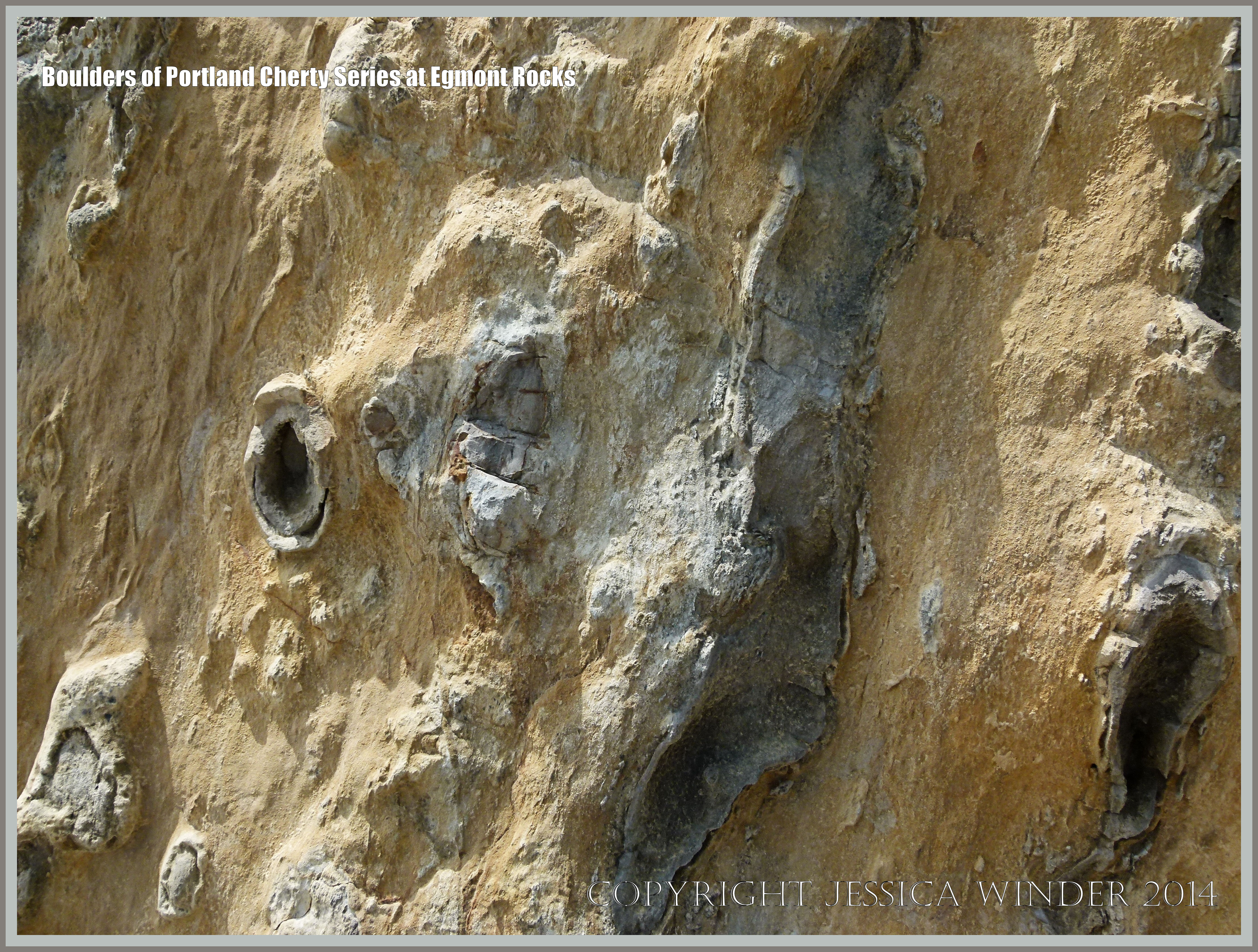 Portland Cherty Series At Egmont Rocks 12 – Close-up of a beach boulder of Portland Cherty Series that has fallen to the shore at Egmont Rocks near Chapmans Pool from the top of Houns-tout on the Jurassic Coast in Dorset, England.