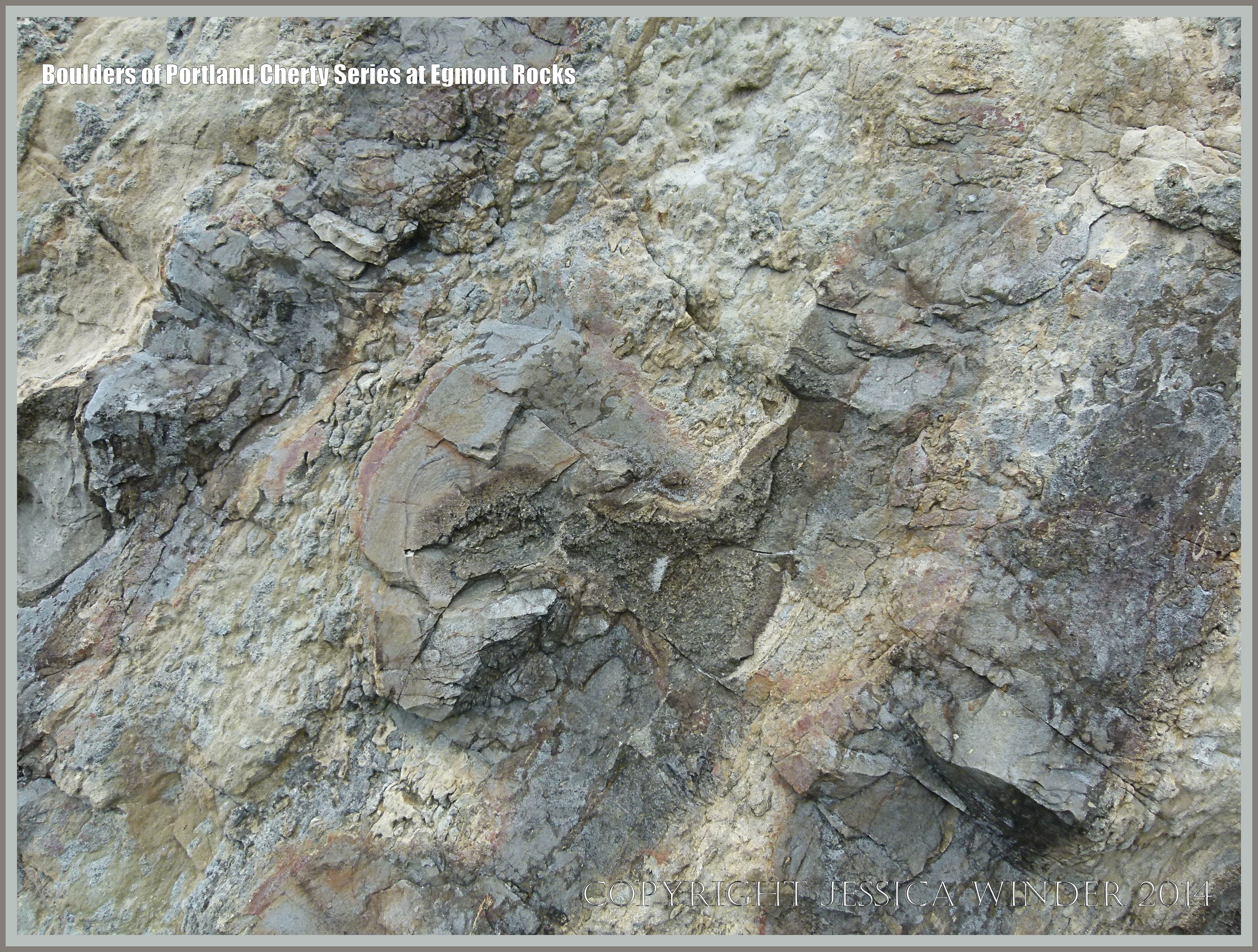 Portland Cherty Series At Egmont Rocks 17 – Close-up of a beach boulder of Portland Cherty Series that has fallen to the shore at Egmont Rocks near Chapmans Pool from the top of Houns-tout on the Jurassic Coast in Dorset, England.