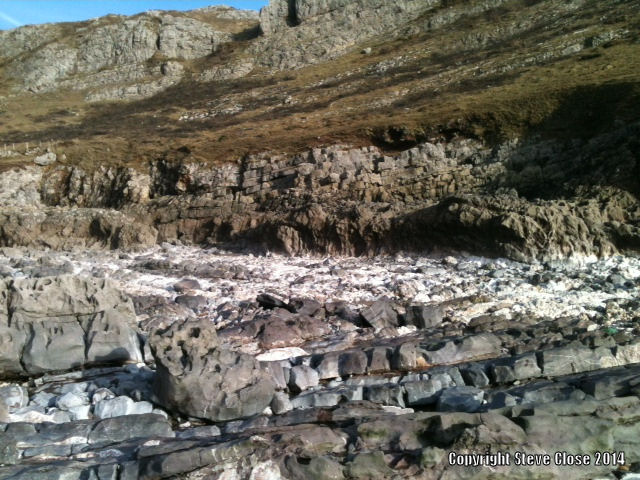 Mewslade 3 – Bare rocks revealed where storms (February 2014) have washed away the sand at Mewslade Bay, Gower in South Wales.
