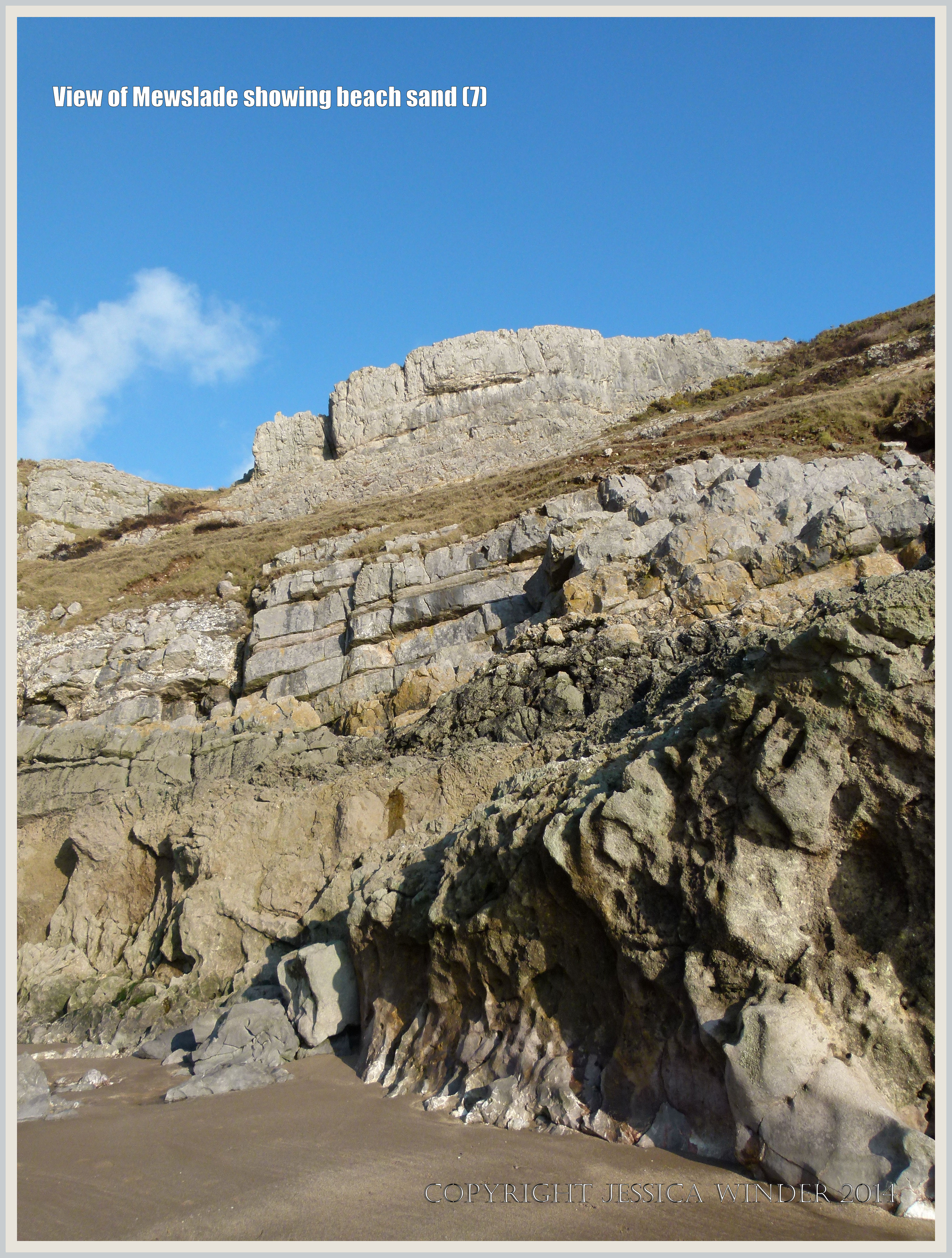 View of Mewslade Bay showing beach sand 7 – Sand which normally covers the wave-cut rock platform at Mewslade Bay on the Gower Peninsula, South Wales, March 2013. Sand was removed by wave action in storms of February 2014.