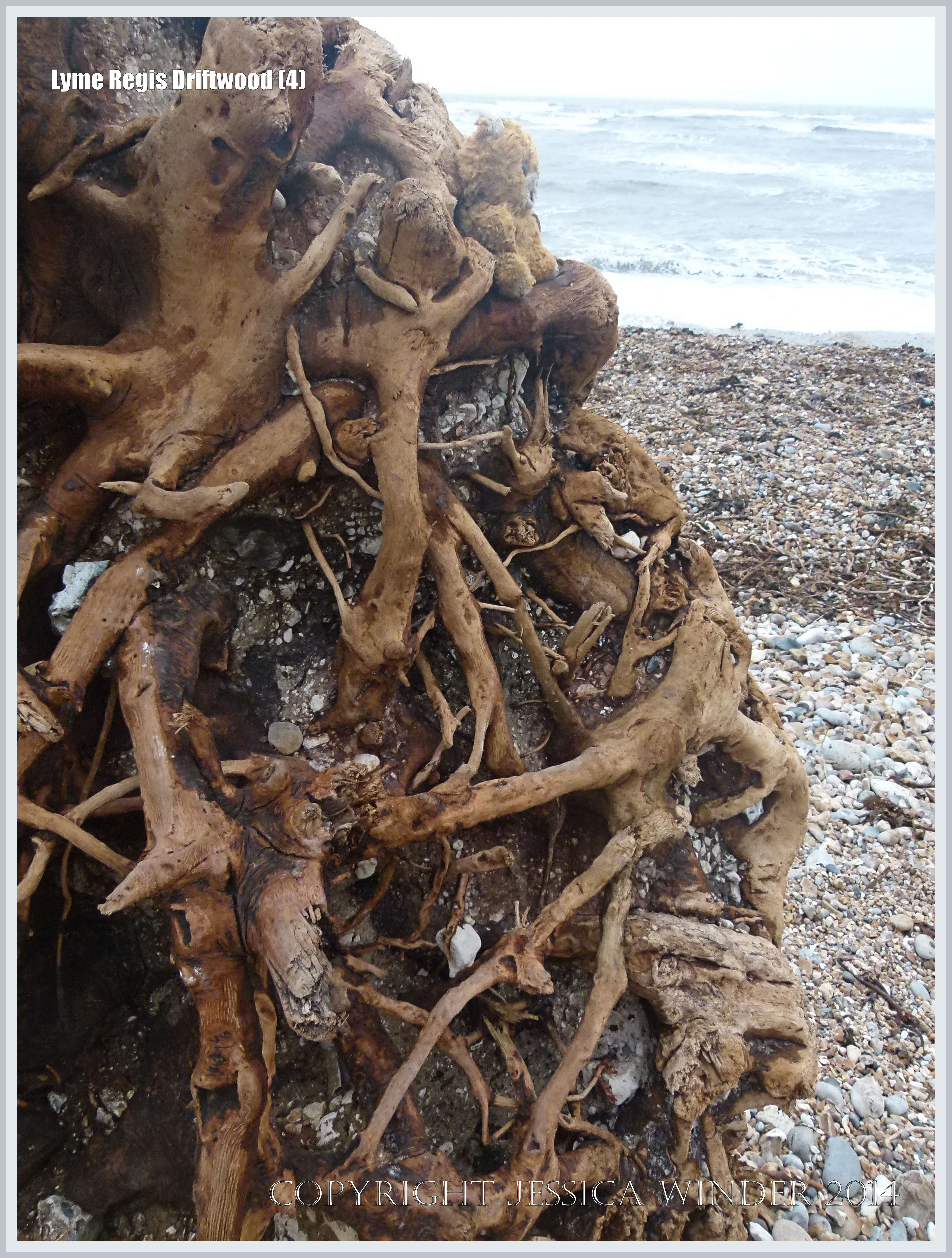 Lyme Regis Driftwood 4 – Tangled root system of a driftwood tree on the shingle beach at Lyme Regis in Dorset, England.