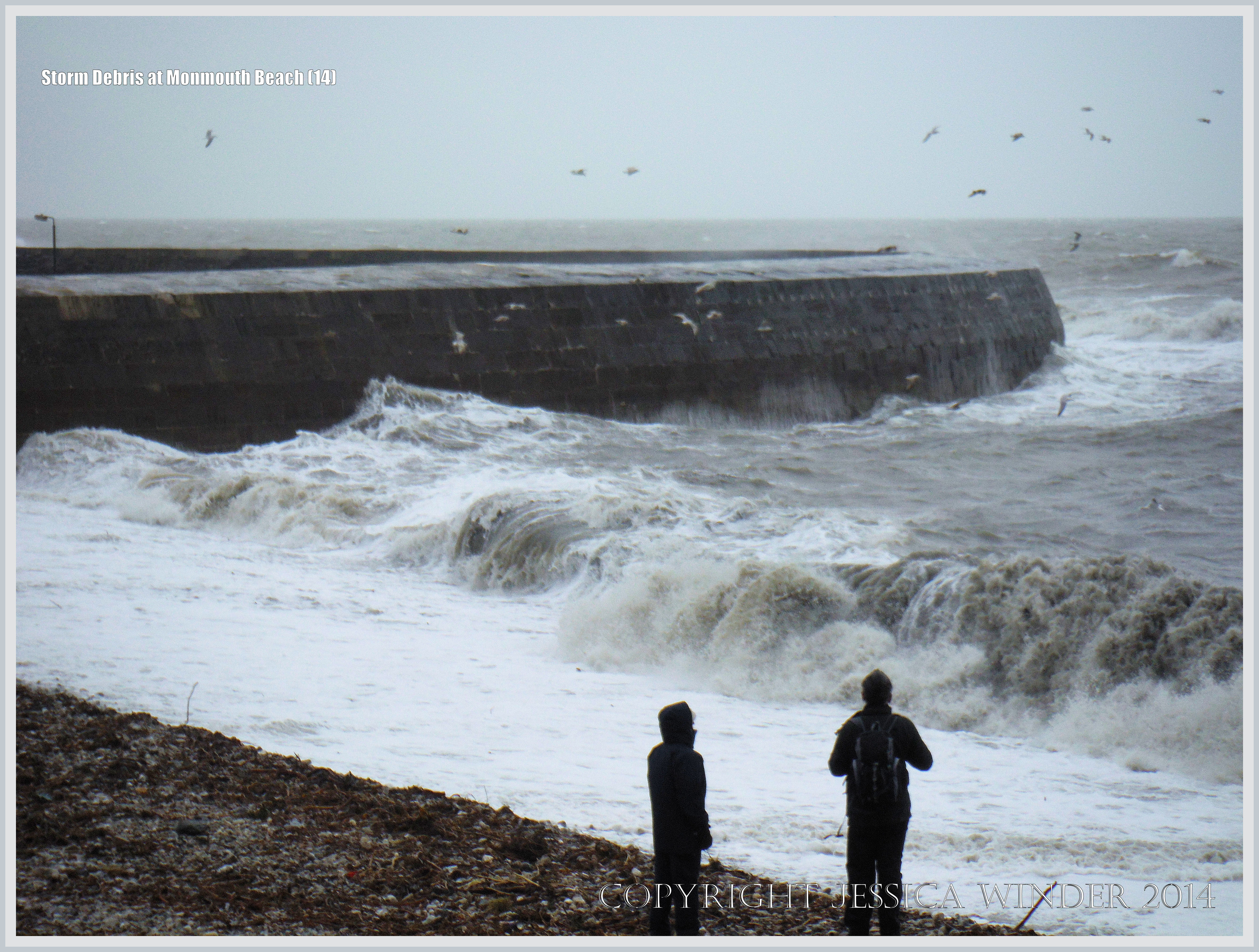 Storm Debris at Monmouth Beach 14 – People looking at storm waves near the Cobb wall at Lyme Regis in Dorset (England)