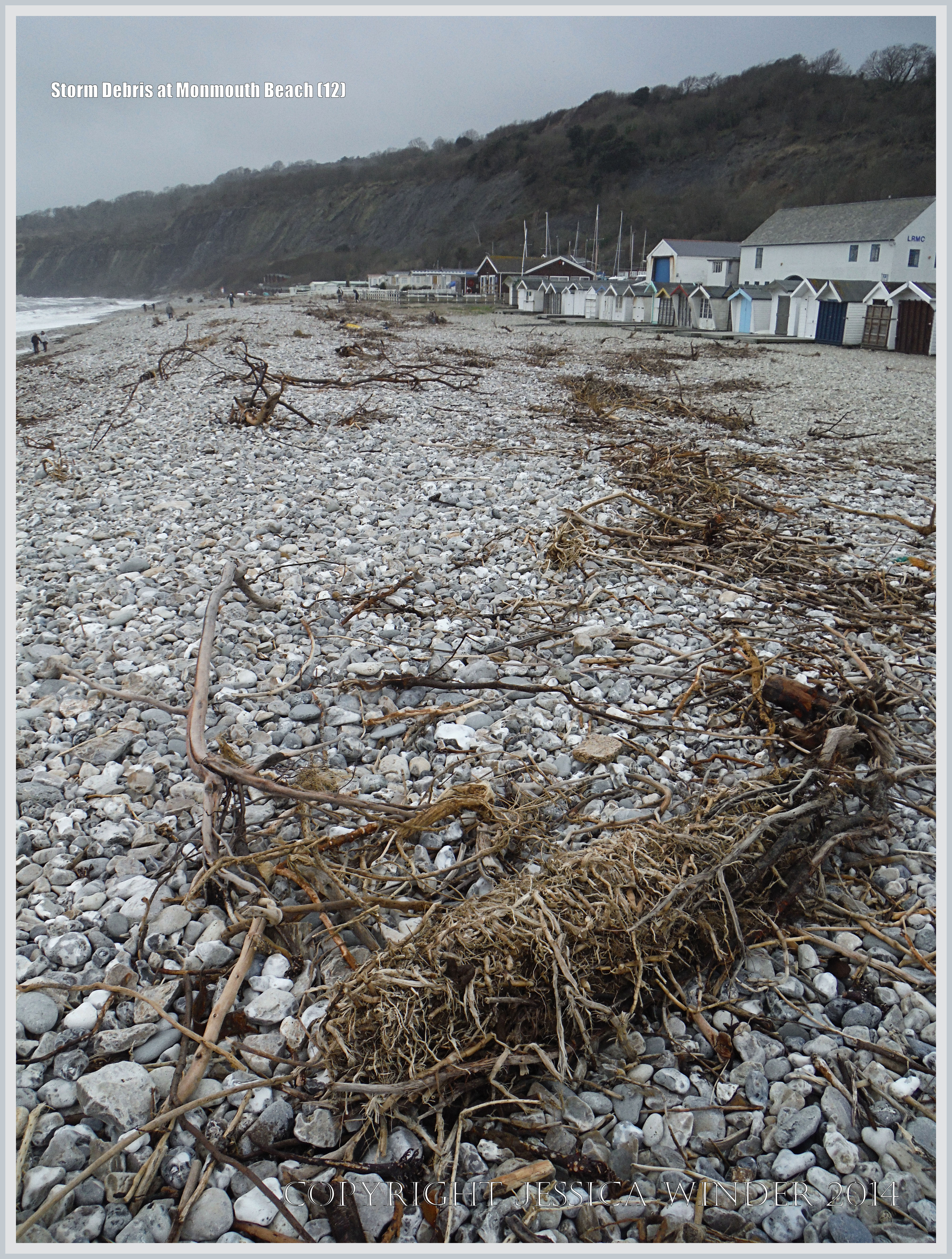 Storm Debris at Monmouth Beach 12 – Driftwood storm debris in a strand-line on the shingle of Monmouth Beach at Lyme Regis in Dorset, England.