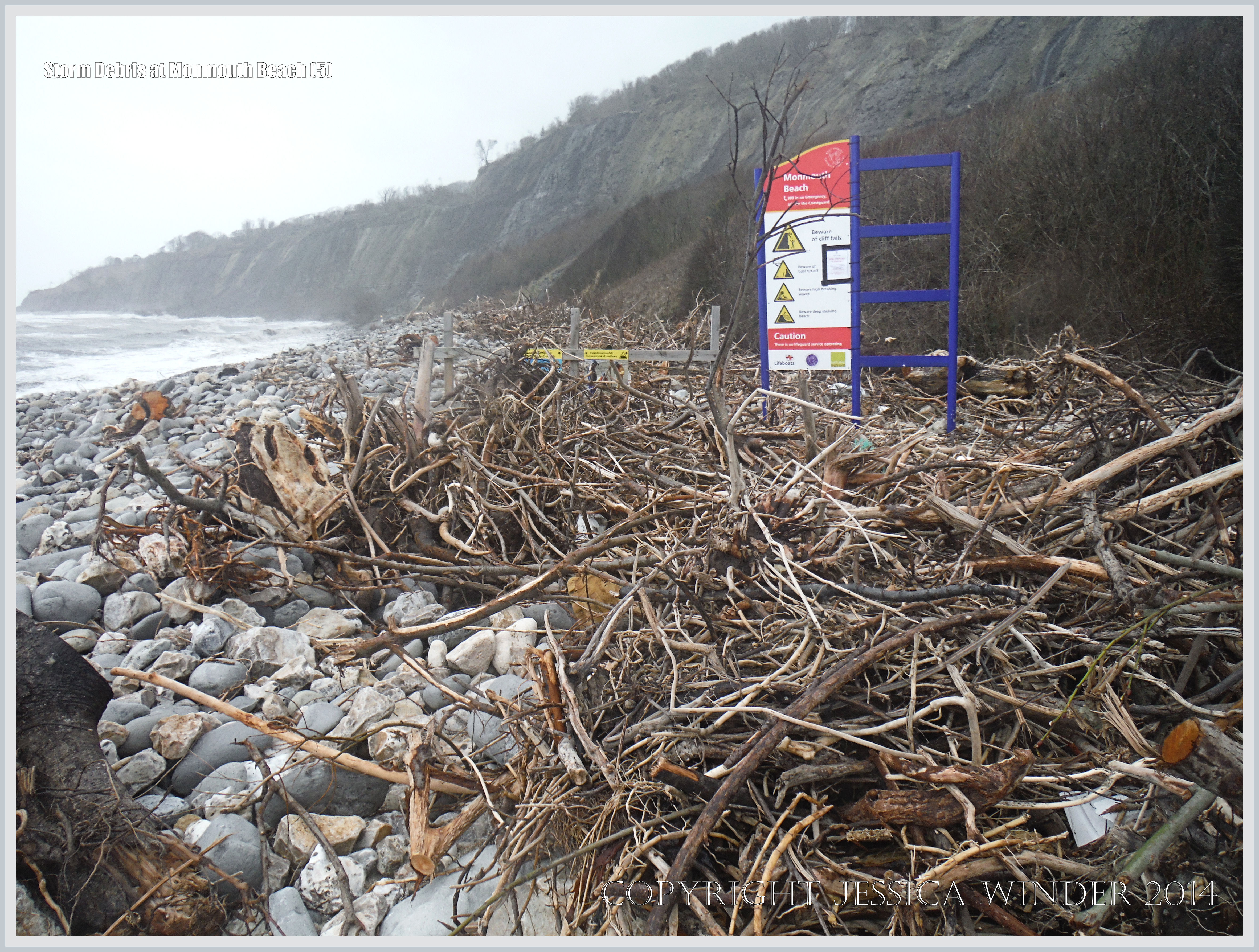 Storm Debris at Monmouth Beach 5 – Driftwood storm debris on a shingle beach with cliff danger warning sign on Monmouth Beach at Lyme Regis in Dorset, England.