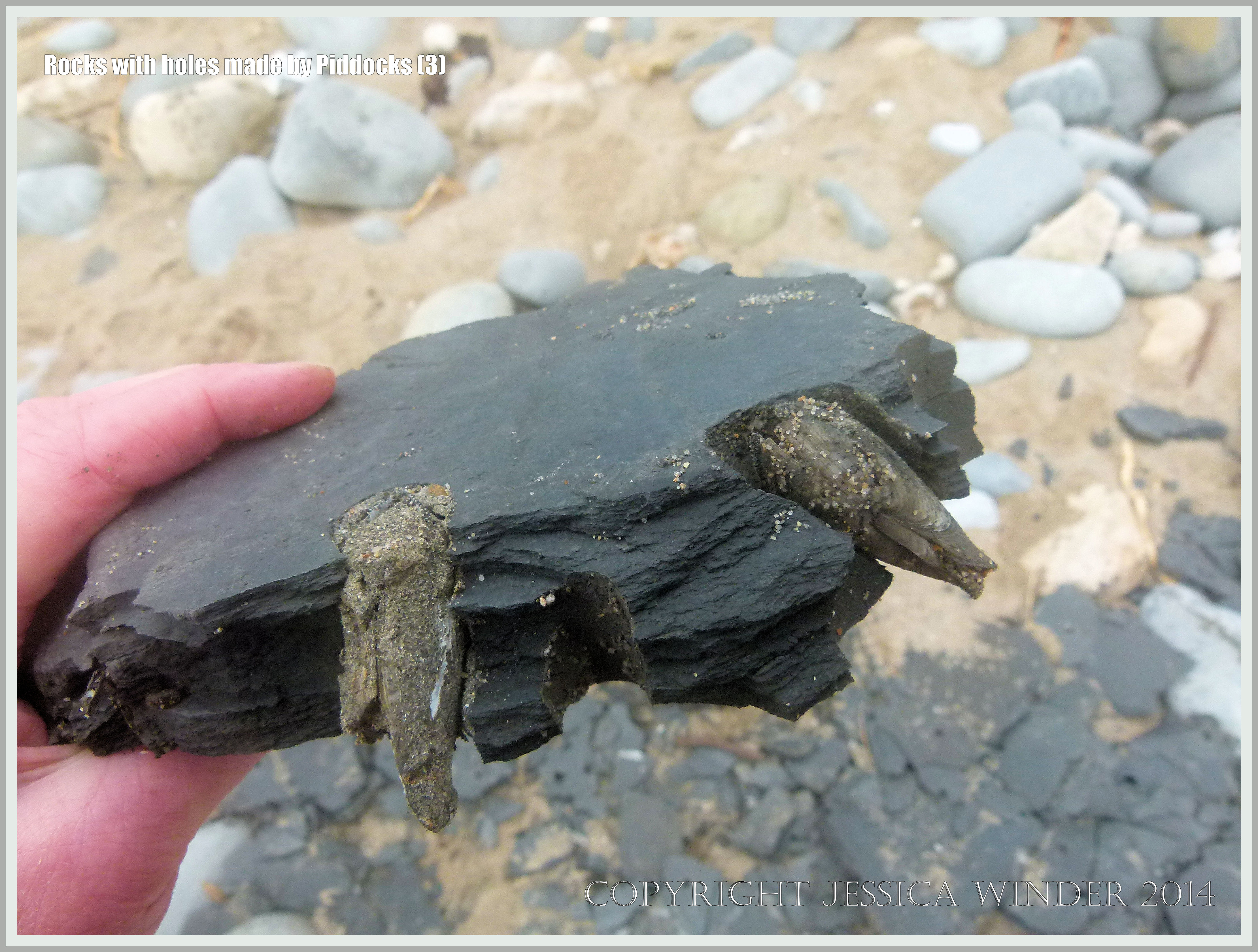 Rocks with holes made by Piddocks 3 – Common Piddocks (Pholas dactylus) in shale rock burrows – washed ashore at Monmouth Beach in Lyme Regis, Dorset, England