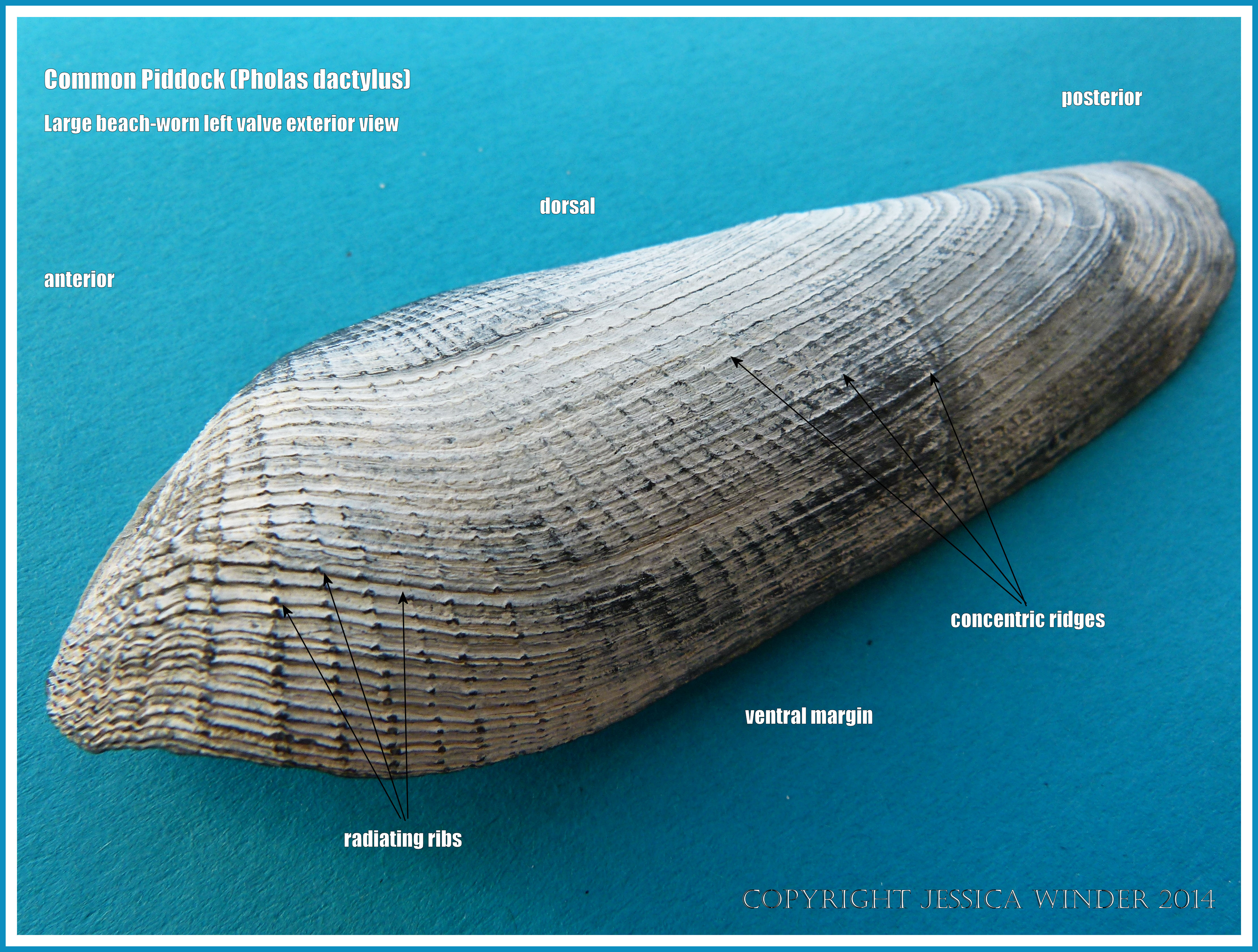 Common Piddock 4 Common Piddock 4 – Exterior view left valve of beach-worn specimen showing outline shape and shell sculpturing