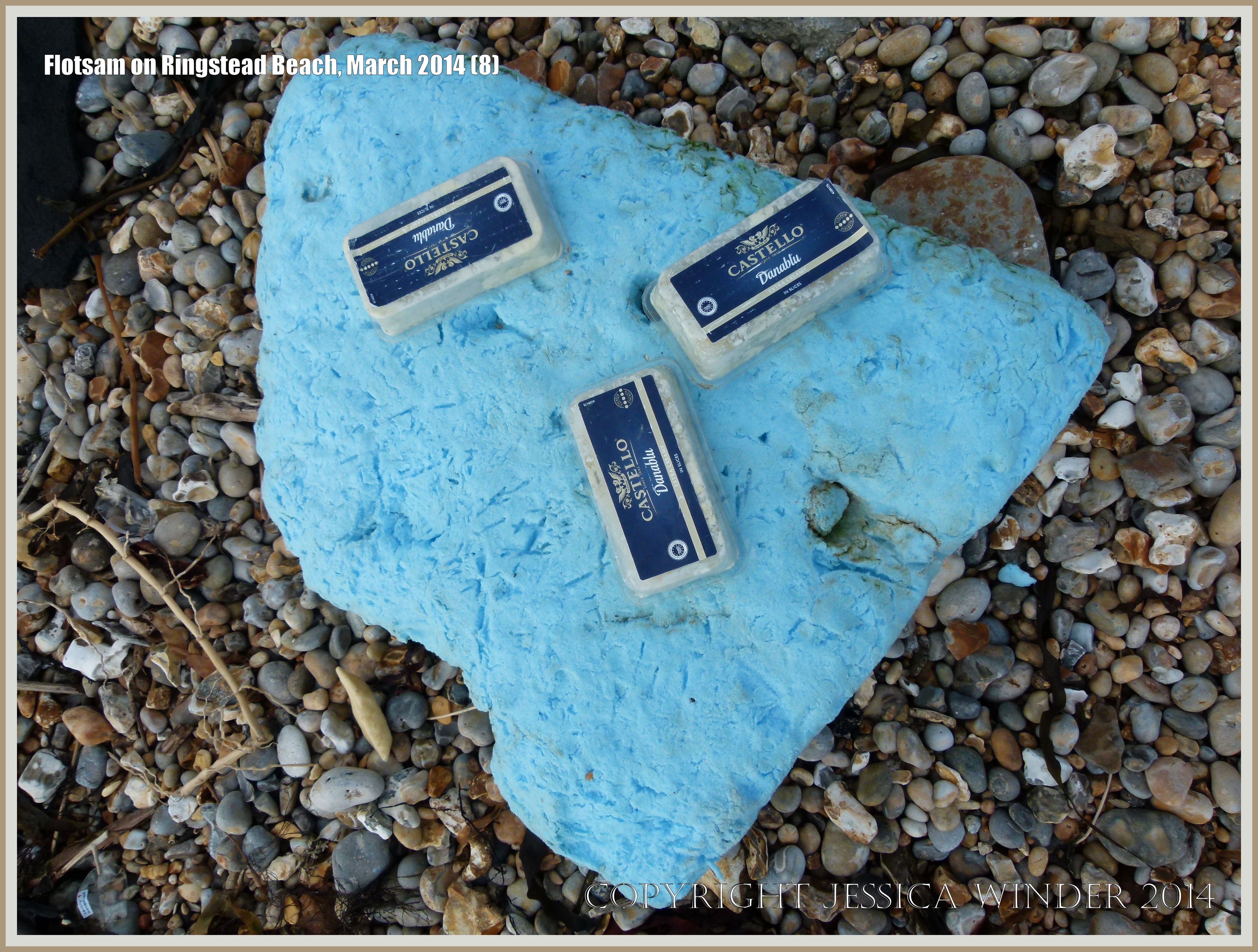 Flotsam on Ringstead Beach 8 – Some of the dozens of flotsam tubs of cheese on the strand-line after washing ashore at Ringstead Bay, Dorset in England, 1st March 2014, following storms that caused cargo from the container ship Svenborg Maersk to fall overboard off the north coast of France.