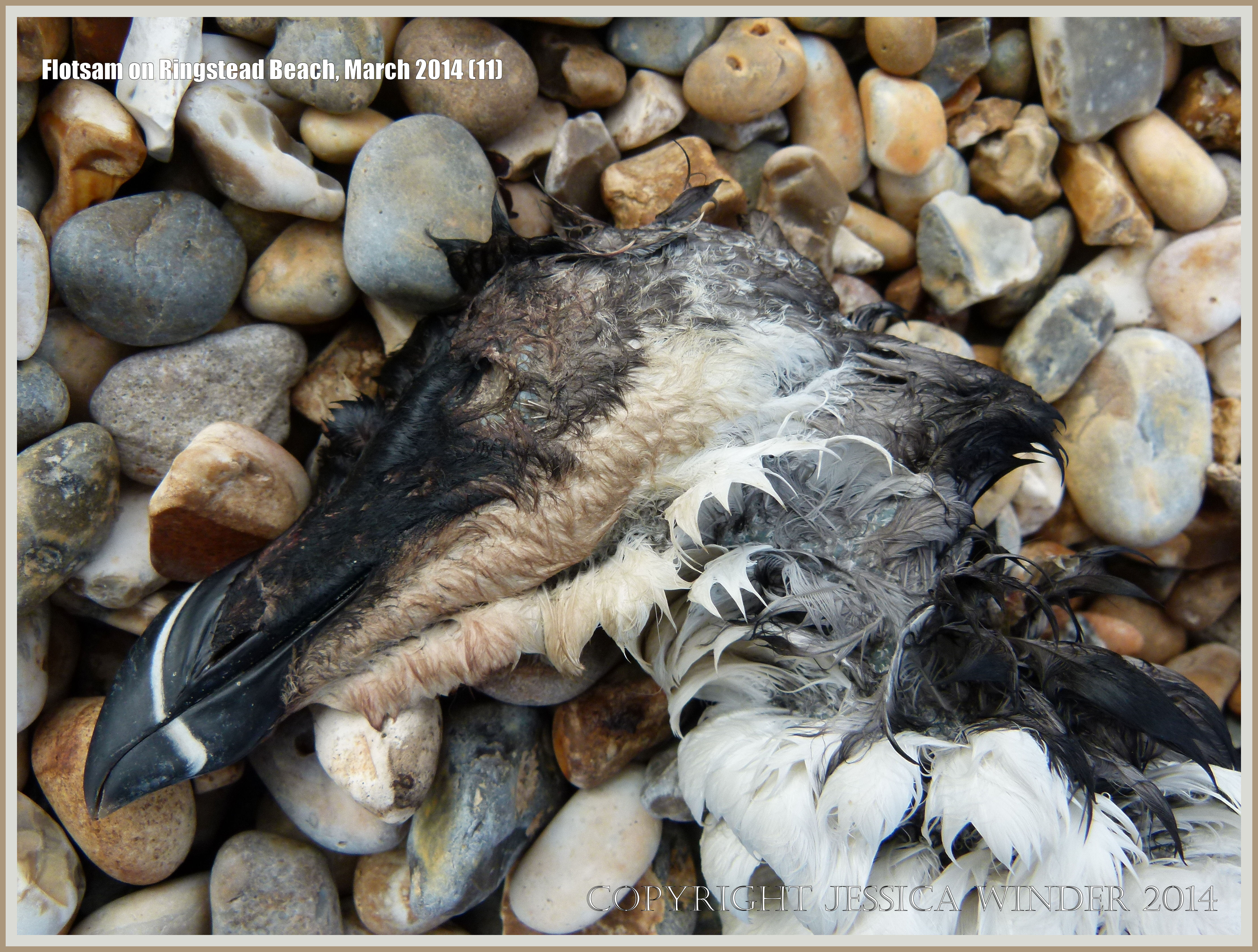 Flotsam on Ringstead Beach 11 – Carcass of dead bird (Razorbill) washed ashore at Ringstead Bay, Dorset in England after storms, 1st March 2014.