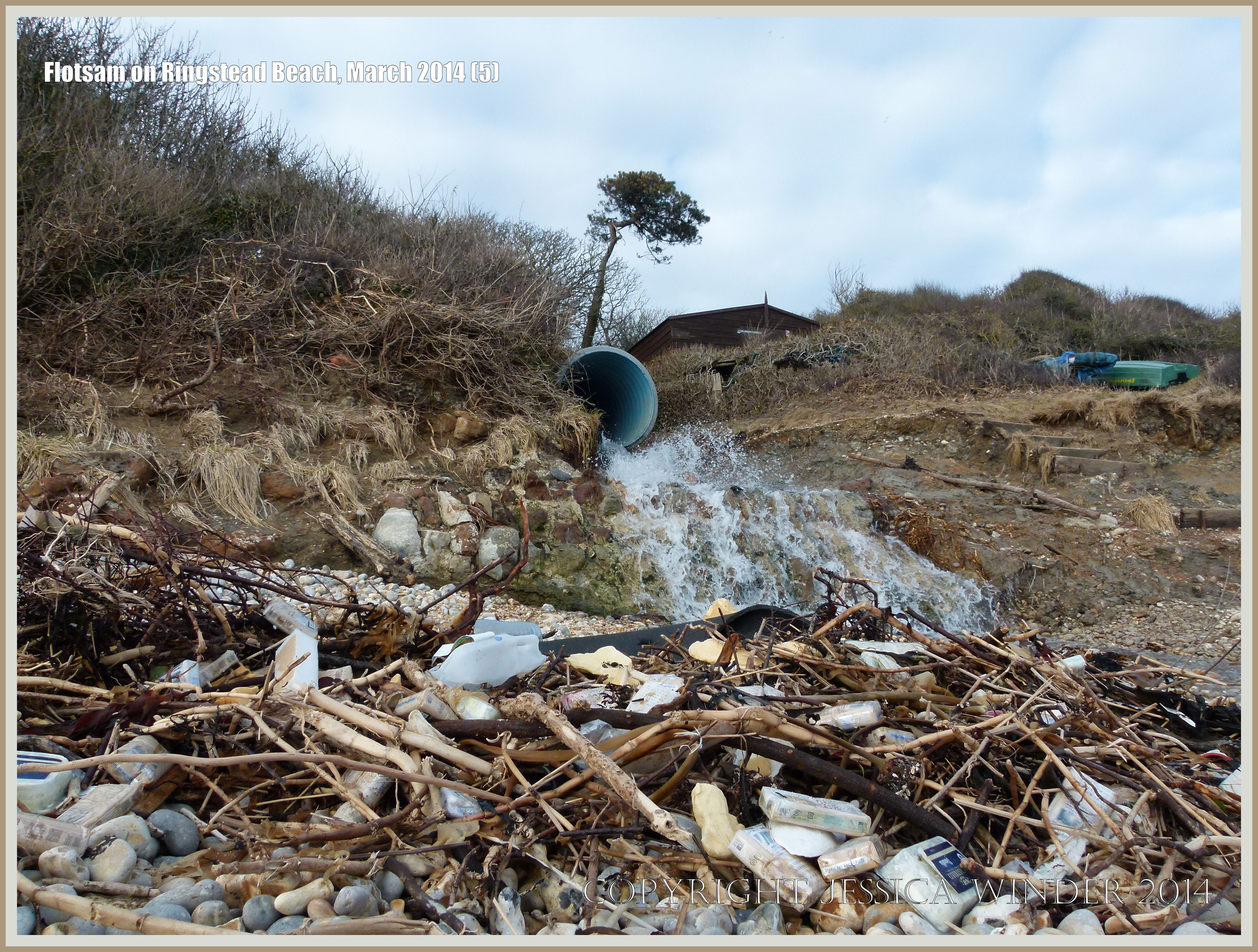 Flotsam on Ringstead Beach 5 – Flotsam packets of cigarettes and plastic tubs of cheese washed ashore at Ringstead Bay, Dorset in England, 1st march 2014, after storms caused cargo from the container ship Svenborg Maersk to fall overboard off the north coast of France.