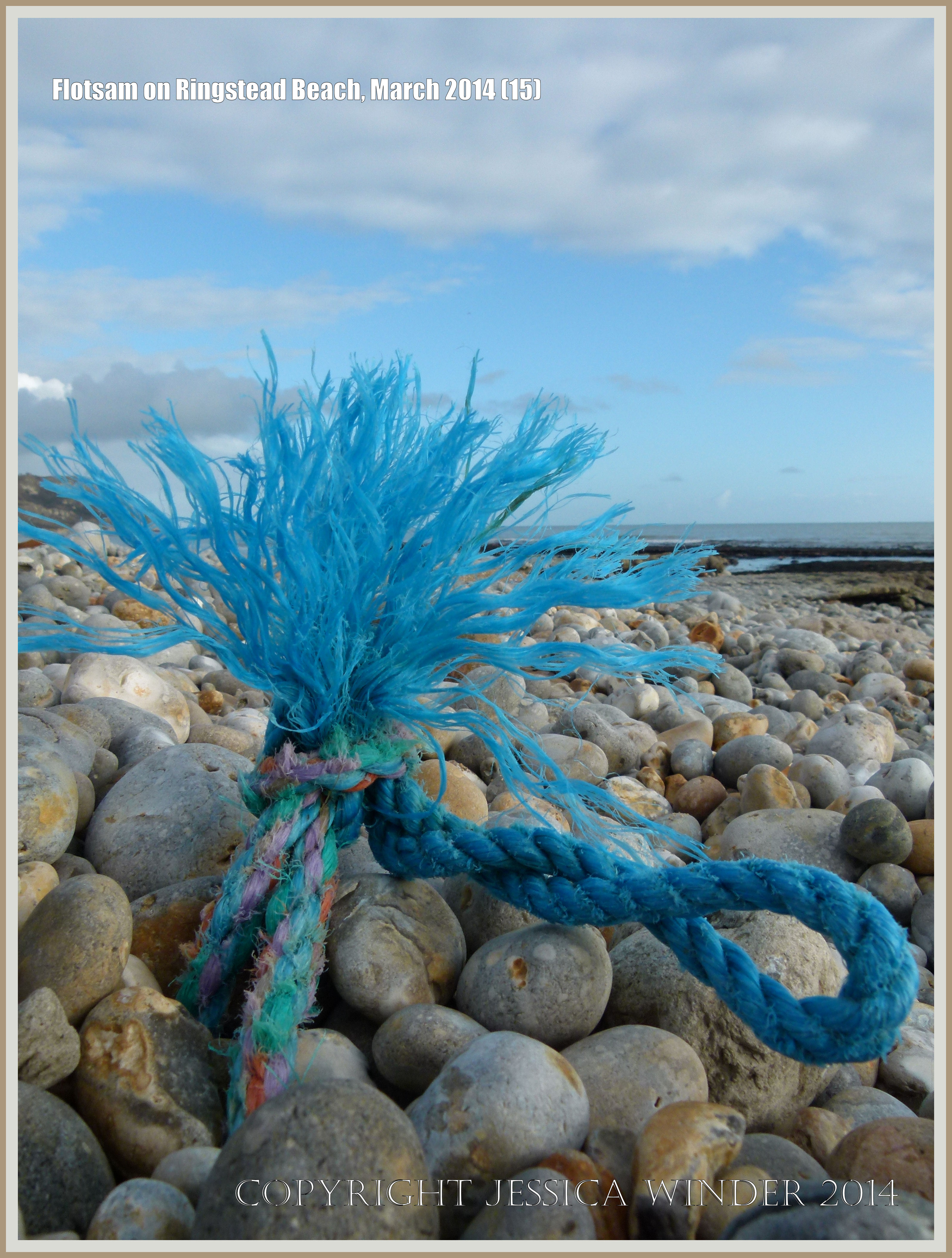Flotsam on Ringstead Beach 15 – Colourful knotted rope flotsam washed ashore at Ringstead Bay, Dorset in England, 1st March 2014.