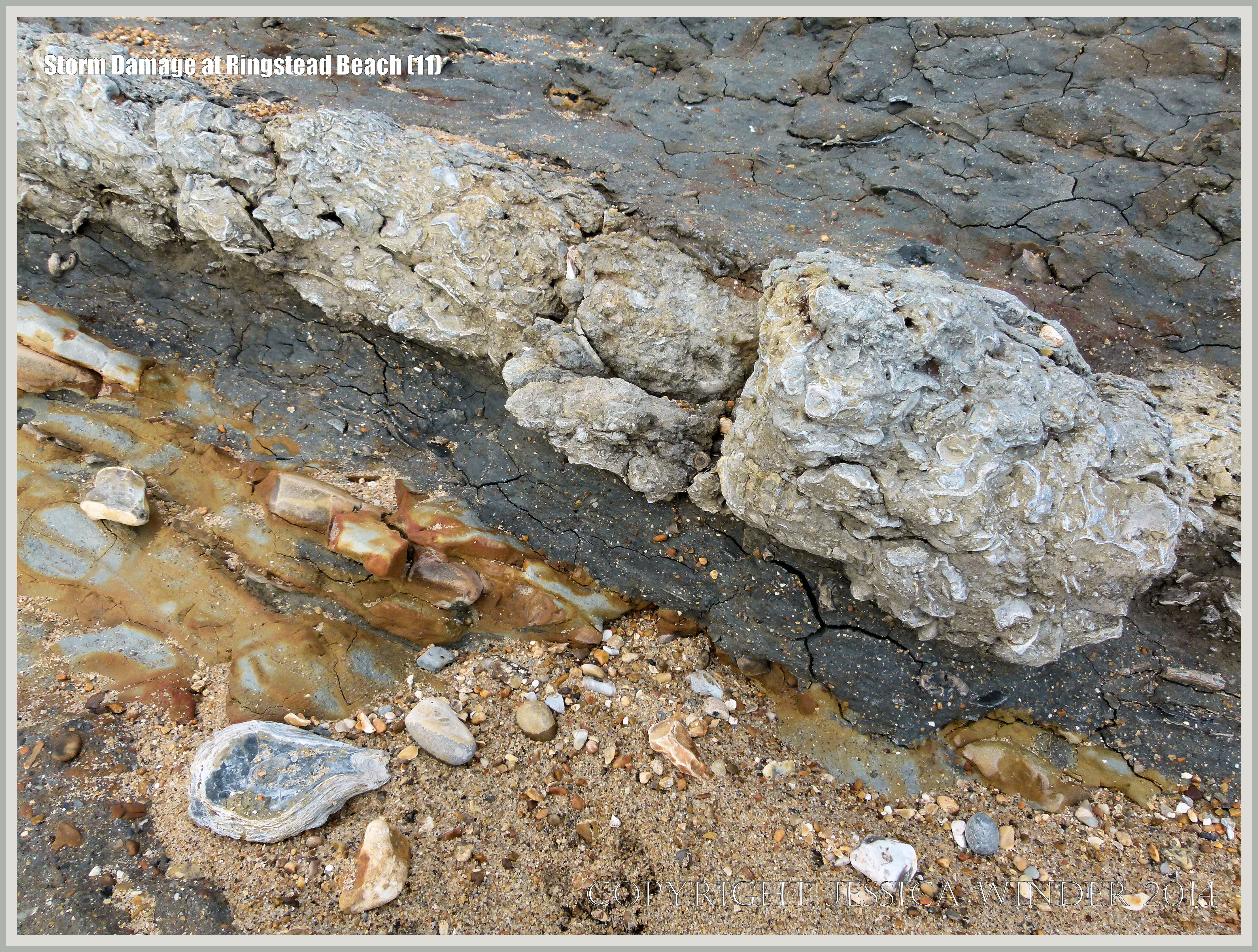 Storm Damage at Ringstead Beach 11 – Exposure of light-coloured fossiliferous Jurassic Ringstead Coral Bed (part of the Osmington Mills Ironstone), with darker and softer Ringstead Waxy Clay below, and Kimmeridge Formation Clay above, at the western end of Ringstead Bay in Dorset, England, 1st March 2014.
