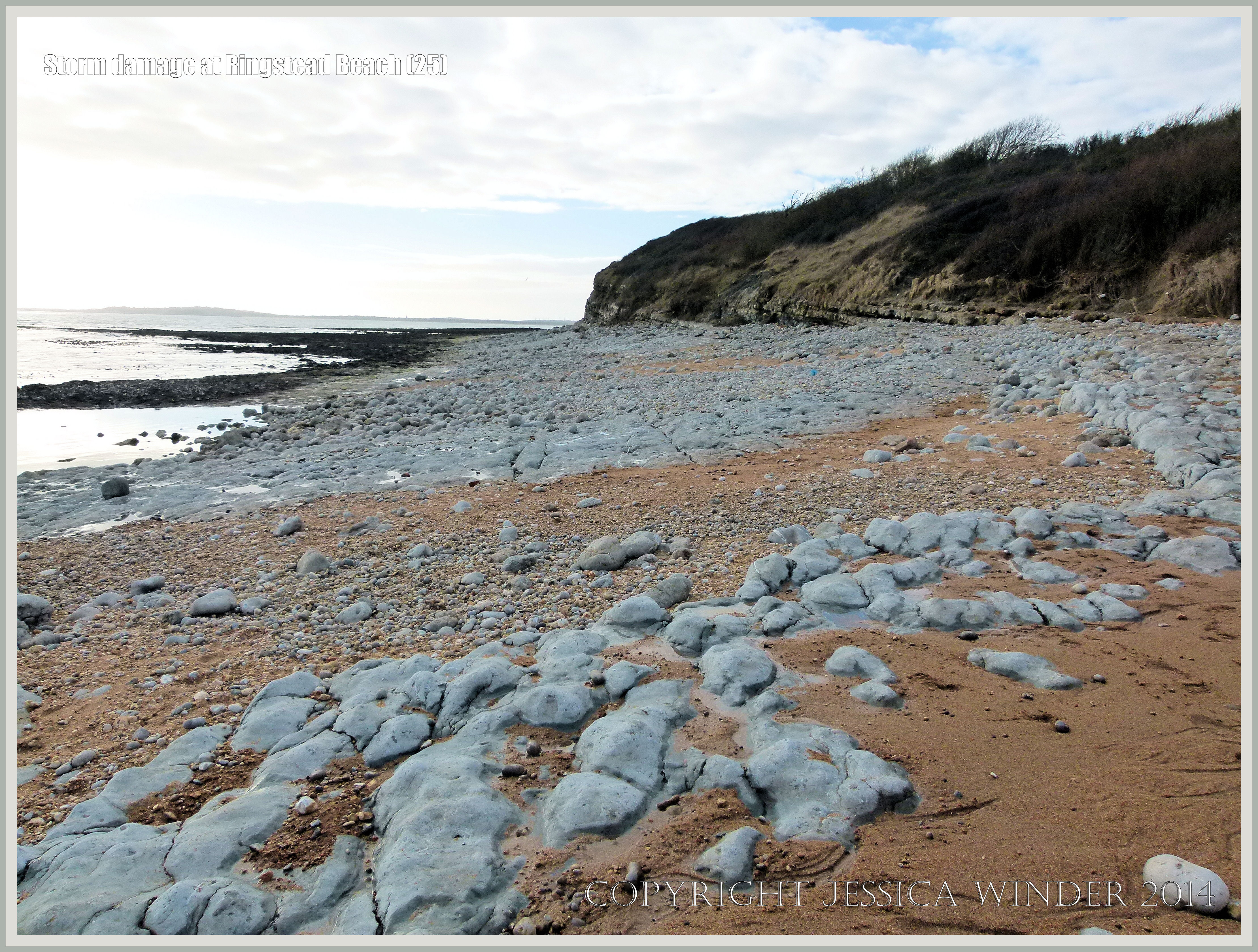 Storm Damage at Ringstead Beach 25 – View over Trigonia Clavellata Formation rock beds to Bran Point at Ringstead Bay in Dorset, England (1st March 2014)