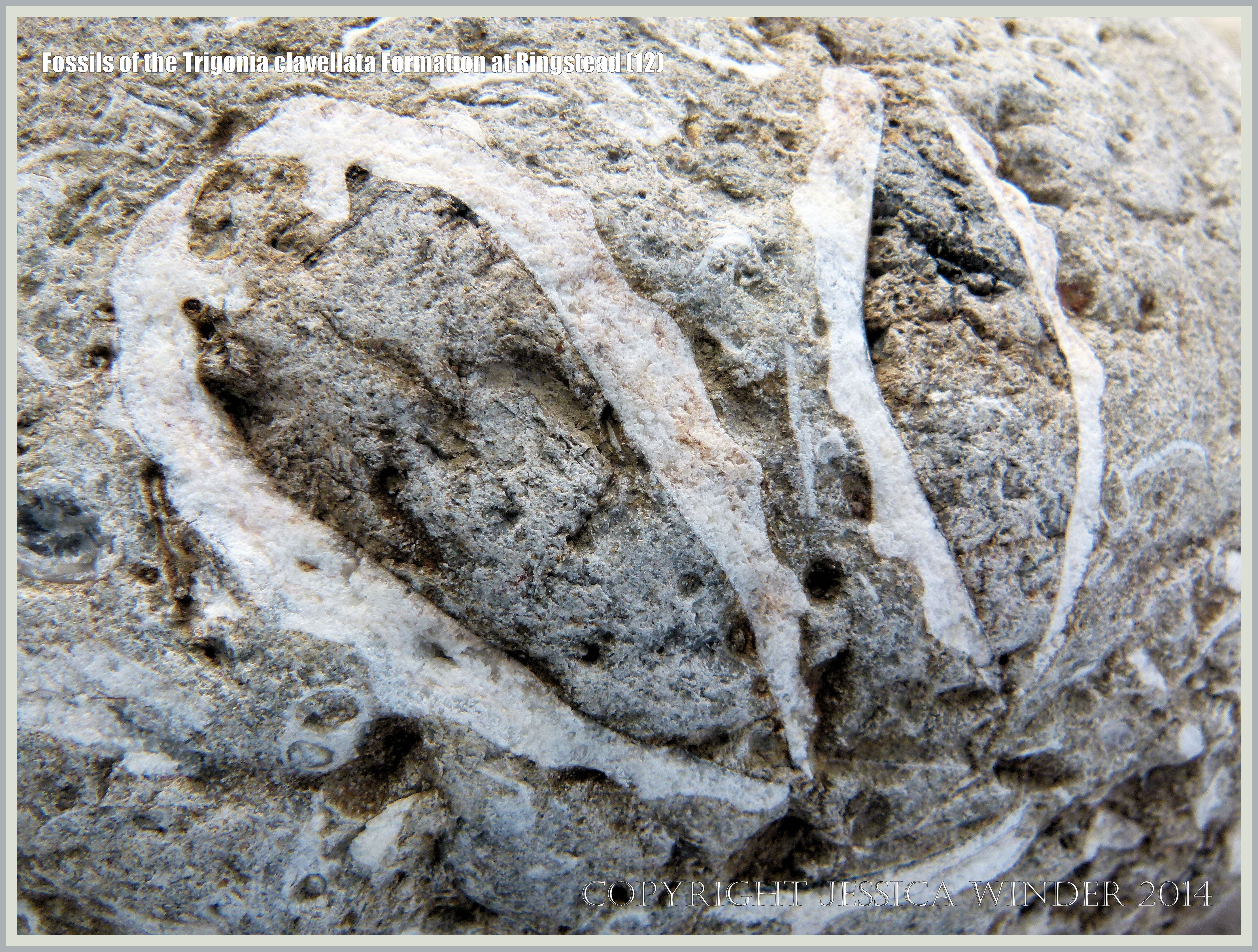 Fossils of the Trigonia clavellata Formation 12 – Fossil bivalve seashells, Myophorella clavellata, in rock from the Trigonia clavellata Formation which is part of the Jurassic Period Corallian Formation at Ringstead Bay in Dorset, England.