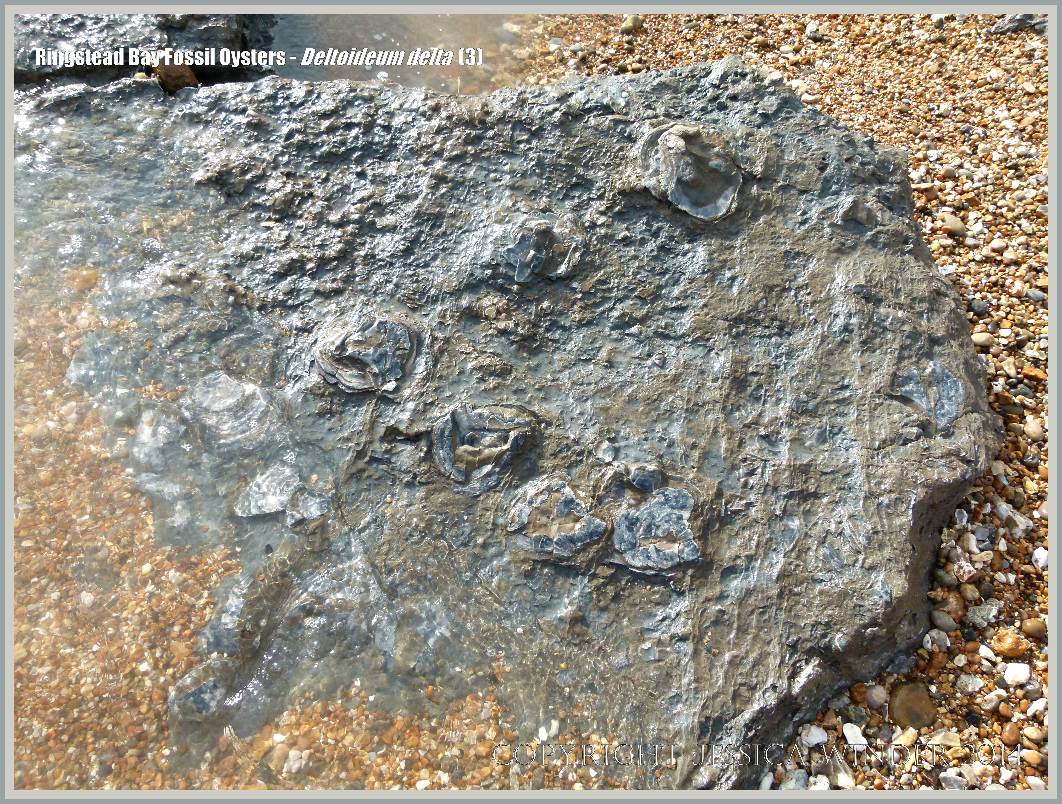 Ringstead Bay Fossil Oysters – Deltoideum delta 3: Low shore rocky outcrop (possibly Sandsfoot Formation) with Deltoideum delta fossil oysters at Ringstead Bay in Dorset, England.