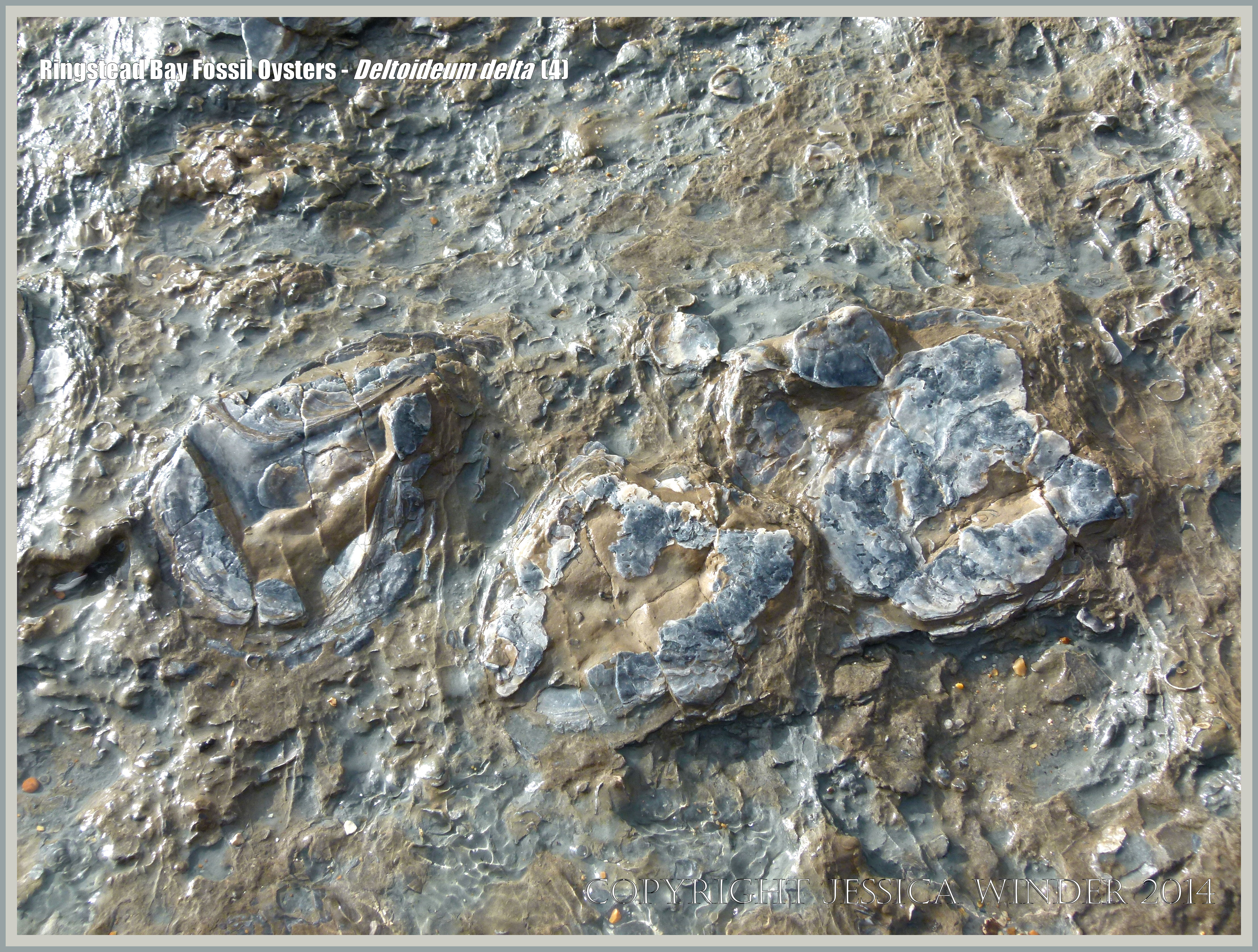 Ringstead Bay Fossil Oysters – Deltoideum delta 4: Low shore rocky outcrop (possibly Sandsfoot Formation) with Deltoideum delta fossil oysters at Ringstead Bay in Dorset, England.