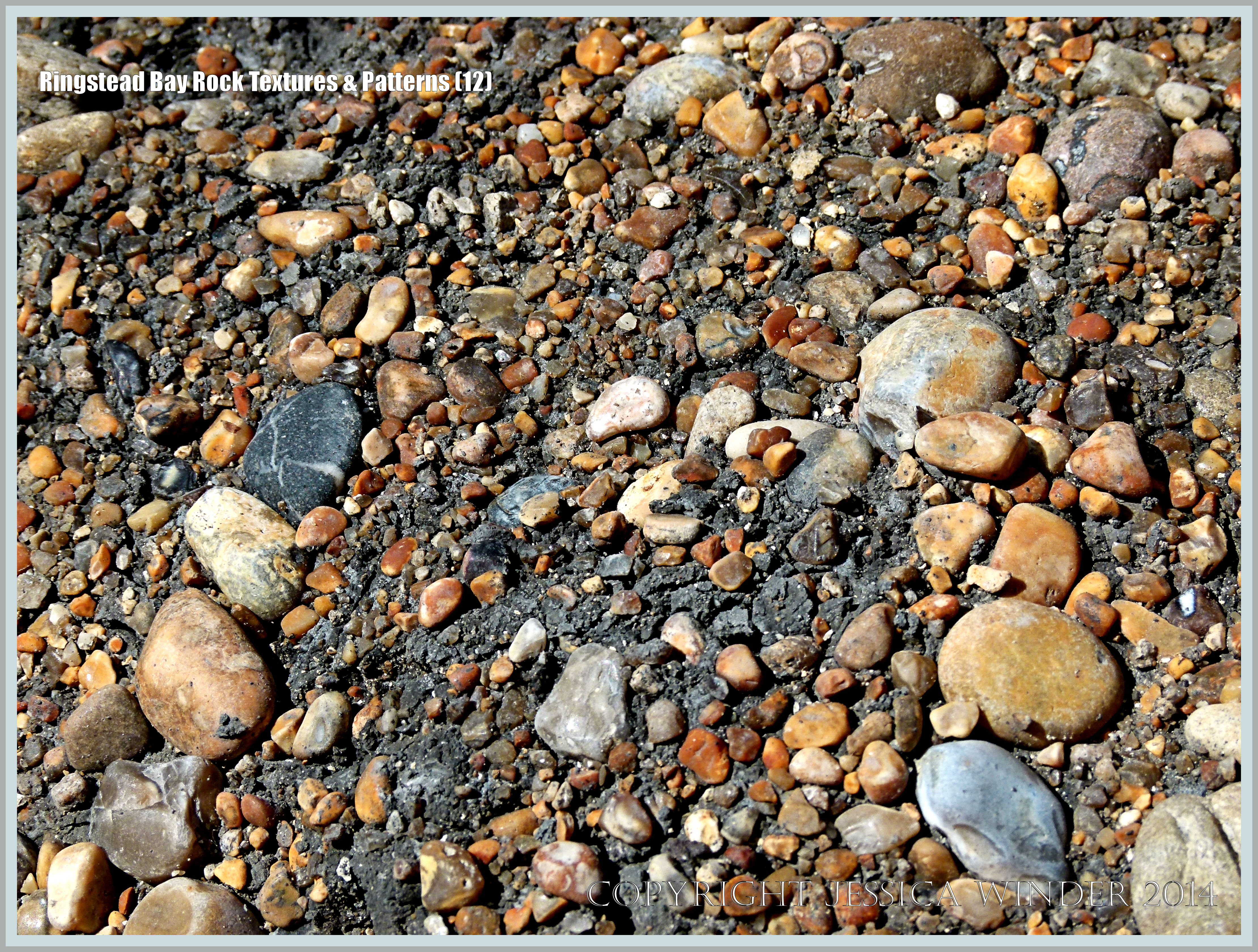 Ringstead Bay Rock Textures & Patterns 12 – Pebbles and gravel stuck in Kimmeridge Clay on the beach below a landslip at Ringstead Bay in Dorset, England.