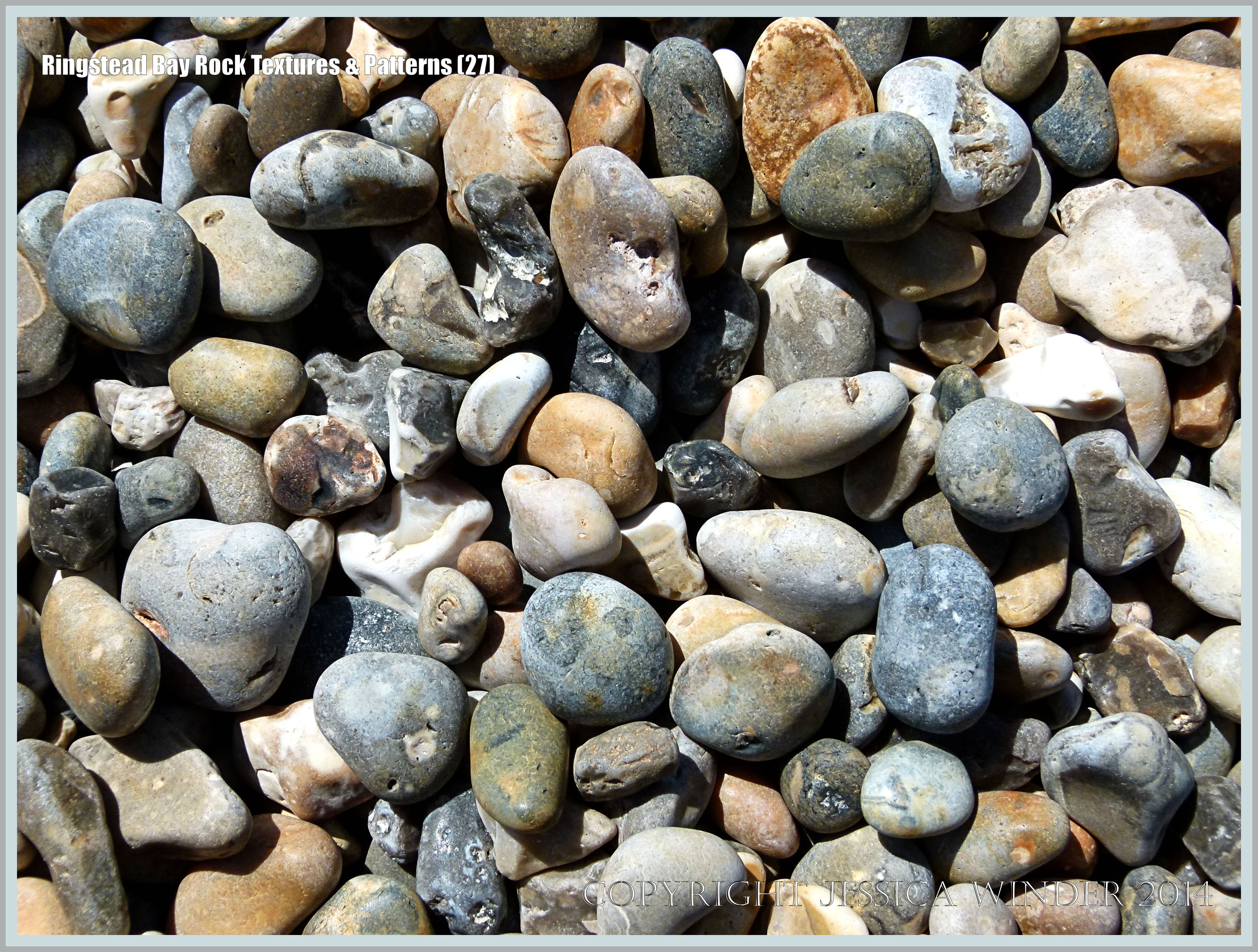 Ringstead Bay Rock Textures & Patterns 27 – Close-up of pebbles derived from the great variety of rocks surrounding the seashore at Ringstead in Dorset, England.