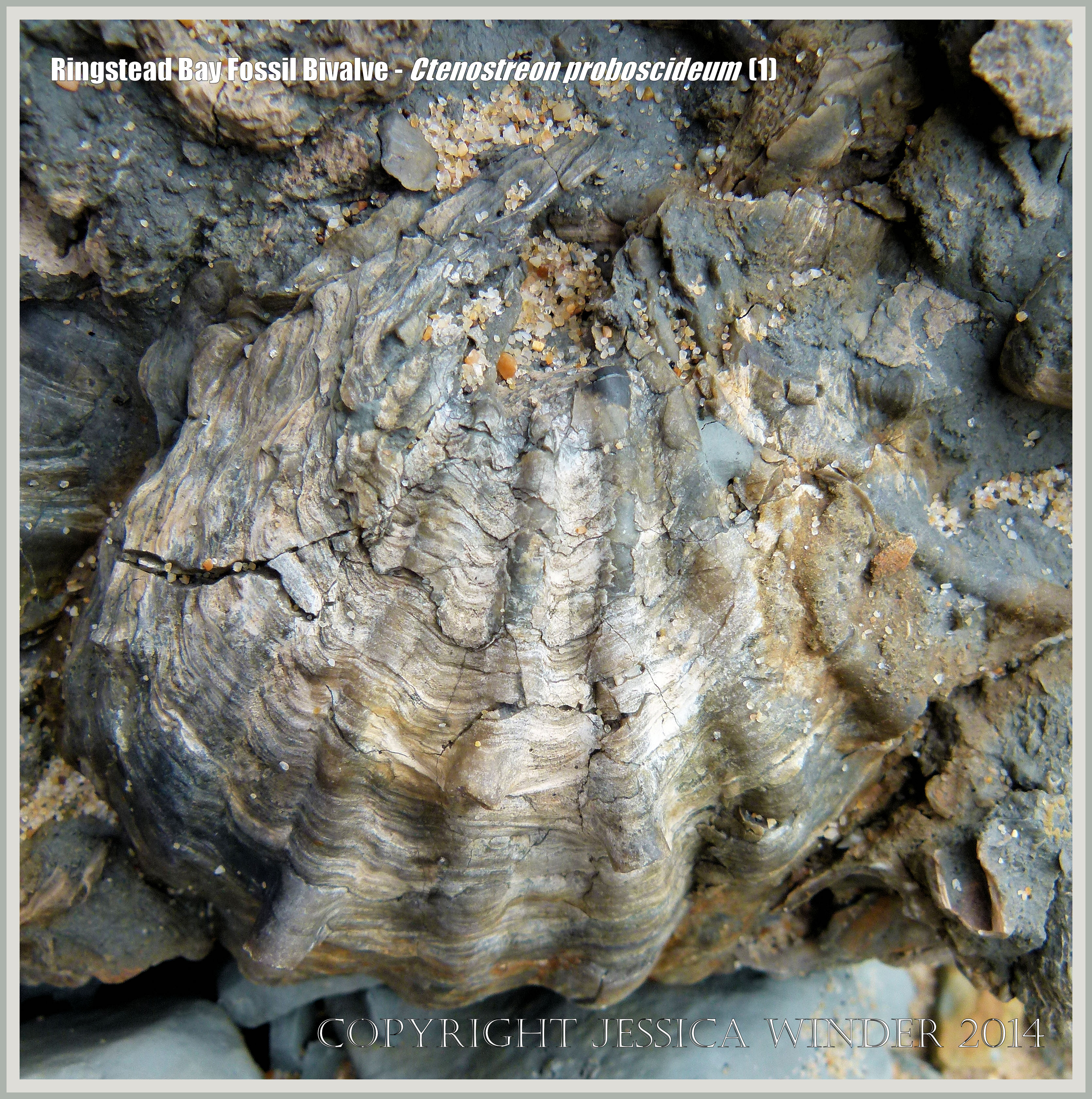 Ringstead Bay Fossil Bivalve Ctenostreon proboscideum 1 – Jurassic fossil bivalve shell (from the Ringstead Coral Bed of the Ringstead Formation which is part of the Corallian Group) embedded in rock on the beach at Ringstead Bay in Dorset, England.