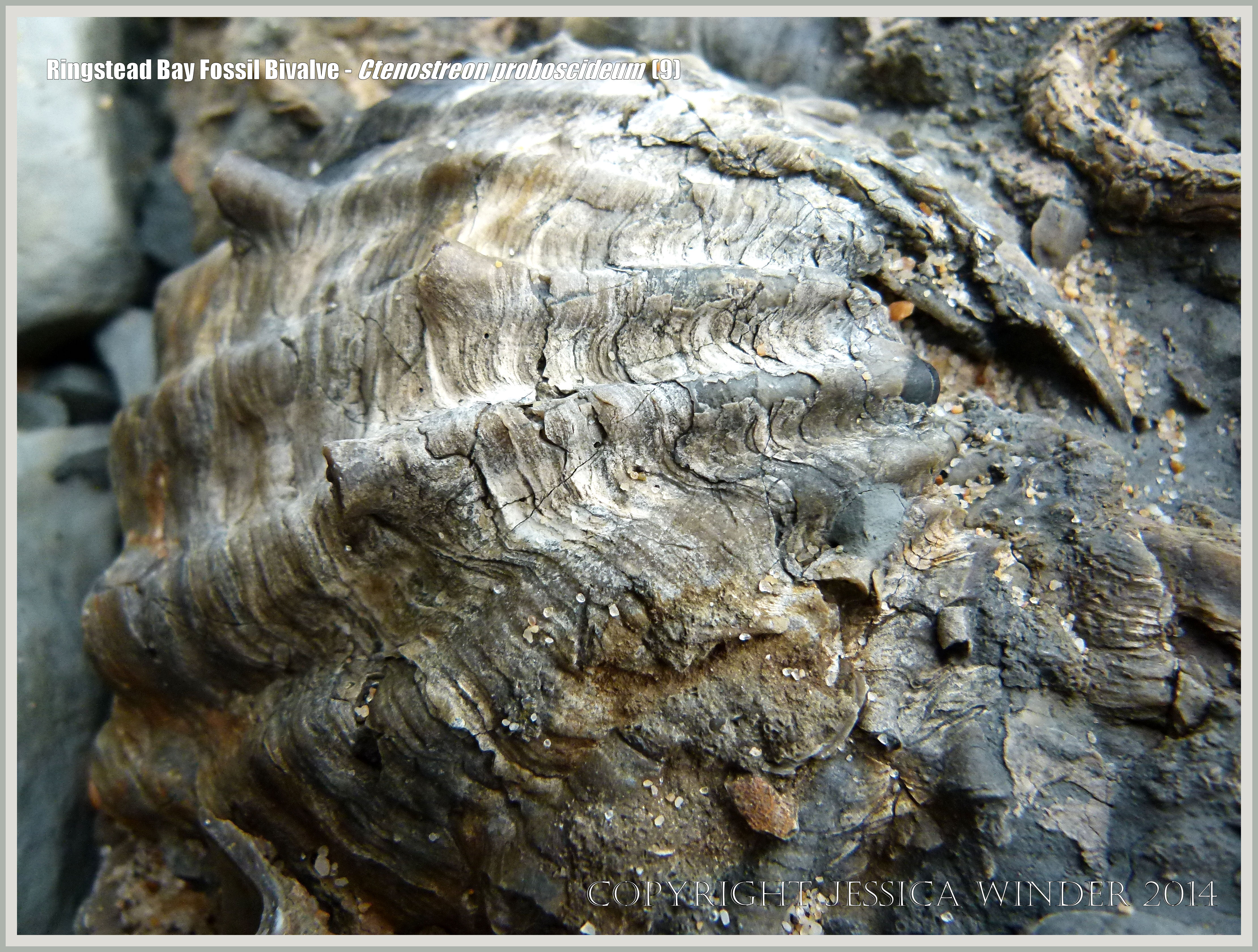 Ringstead Bay Fossil Bivalve Ctenostreon proboscideum 9 – Jurassic fossil bivalve shell (from the Ringstead Coral Bed of the Ringstead Formation which is part of the Corallian Group) embedded in rock on the beach at Ringstead Bay in Dorset, England.