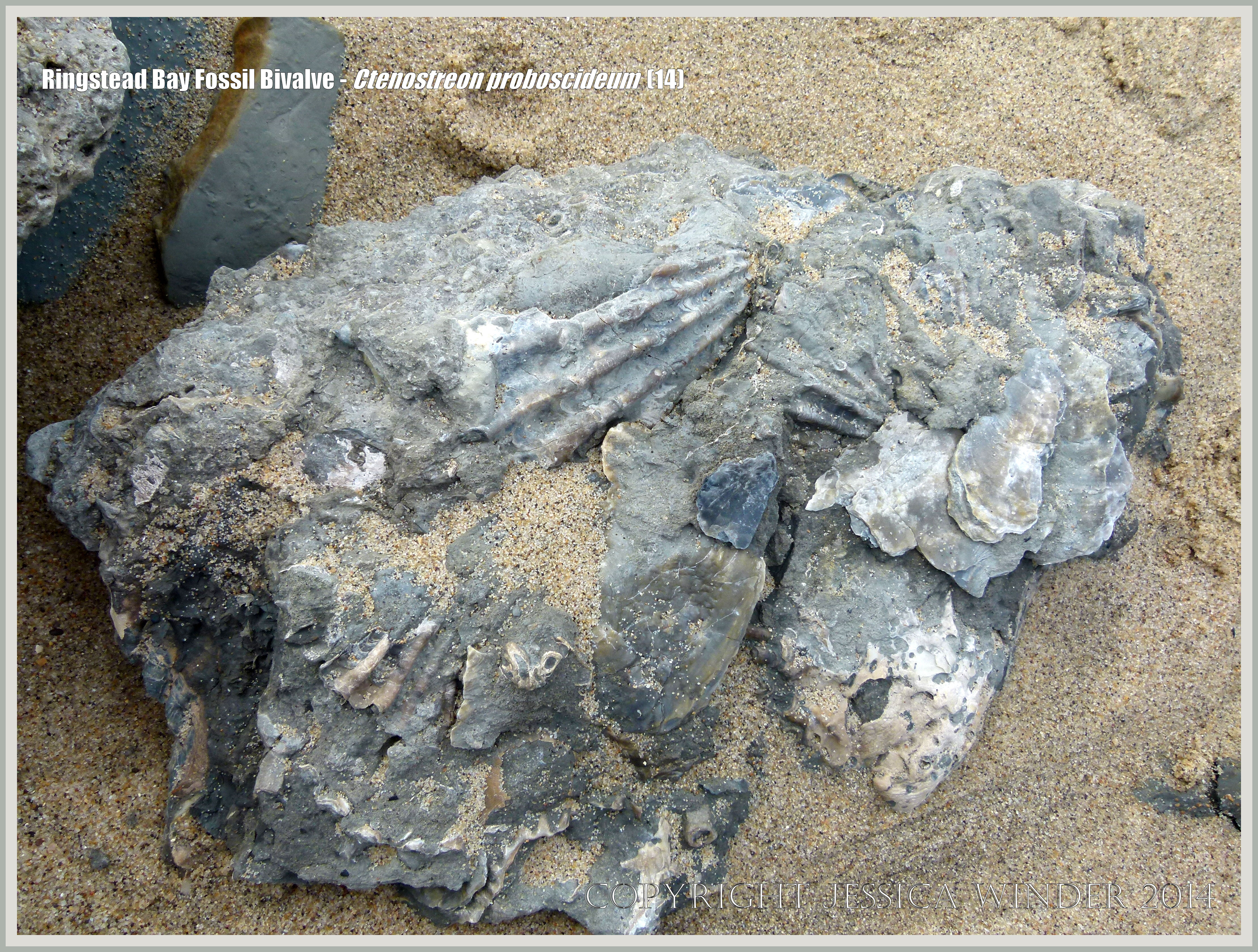Ringstead Bay Fossil Bivalve Ctenostreon proboscideum 14 – Jurassic fossil bivalve shells, including broken Ctenostreon proboscideum, embedded in rock that has fallen from the Ringstead Coral Bed layer at the top of the shore at Ringstead Bay in Dorset, England.