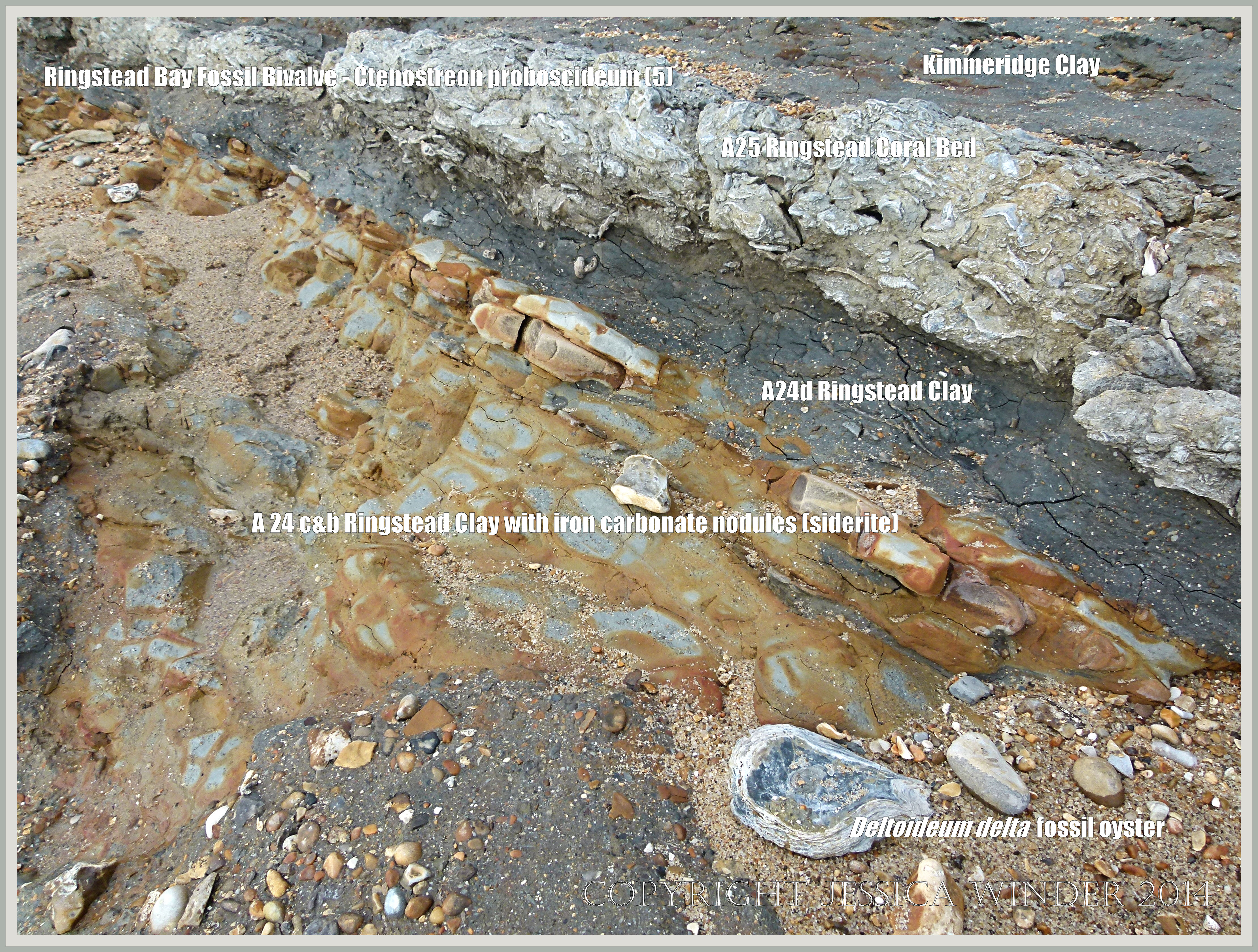 Ringstead Bay Fossil Bivalve Ctenostreon proboscideum 5 – Vertical section through Jurassic strata at the top of the shore, showing the Ringstead Coral Bed in which the C. proboscideum fossils were found, with Ringstead Clays and siderite nodules below, at Ringstead Bay in Dorset, England