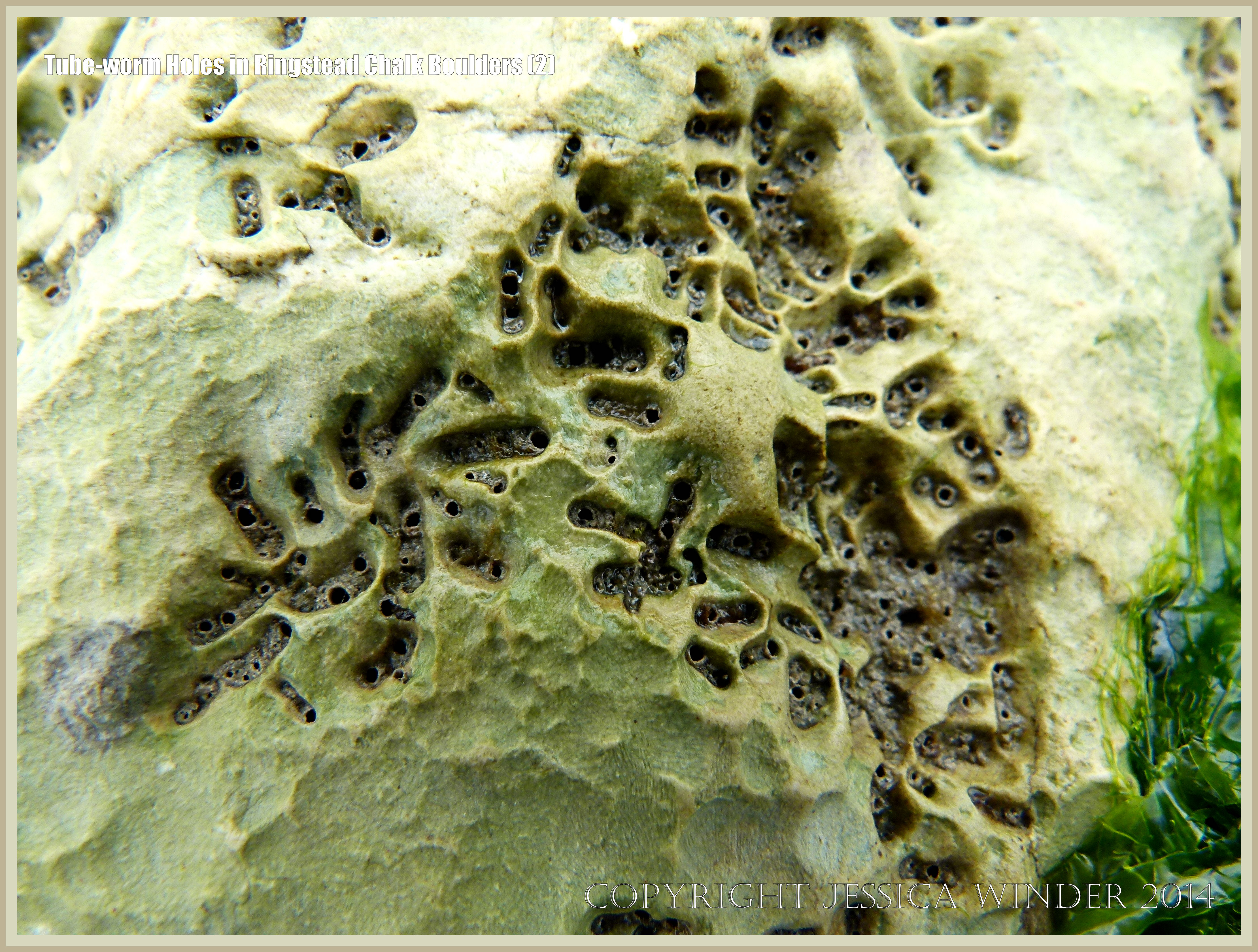 Tube-Worm Holes in Ringstead Chalk Boulders 2- Chalk seashore boulder with tube-worm holes that are still occupied by the living worms, most likely Spionid polychaetes of the Polydora genus, at Ringstead Bay in Dorset, England. Microscopic algae have coloured the chalk pale green. Within the chalk burrows the sand, mud and mucus tubes made by the worms are visible.
